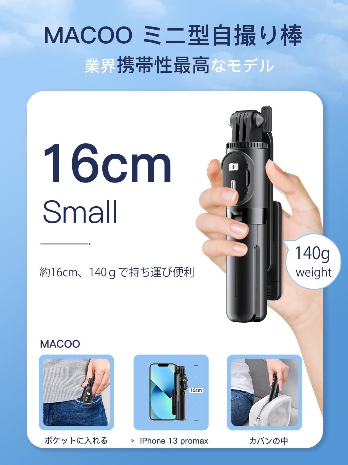 【軽量、ポケットサイズ】MACOOは自撮り棒を使用するシーンを考えて、数え切れないほどの実験の経て、自撮り棒の機能が満たされている状態で更に小型に進化しました。自撮り棒は71cmまで伸縮可能、折り畳んだ状態は16㎝、500mlのペットボトルよりも小さい、薄さは半分ぐらい、ズボンのケットにも入ります。じどり棒の重量は約140g、市販商品と比べると35%軽量化して、持ち運びは非常に便利です!