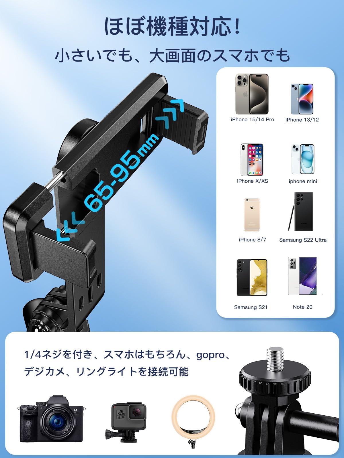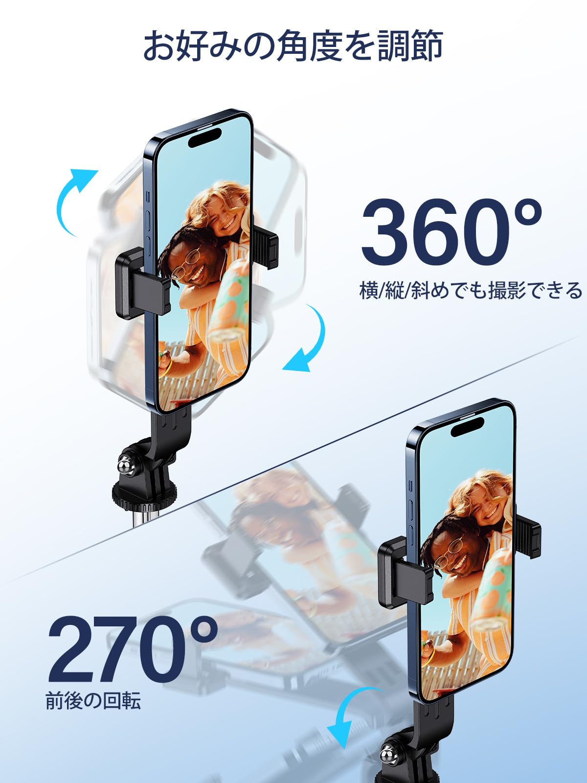 【360°+260°全方位自由調節】自 撮り 棒のクランプは従来型にある水平360°回転を受け継いだ以外、より一層改良できたところは上下260°回転実現、撮影角度を気にする必要はありません。横幅4〜7インチのスマホをじどり棒のホルダーに装着するのが可能、小さい端末でも、大画面の端末でもしっかり固定できます!