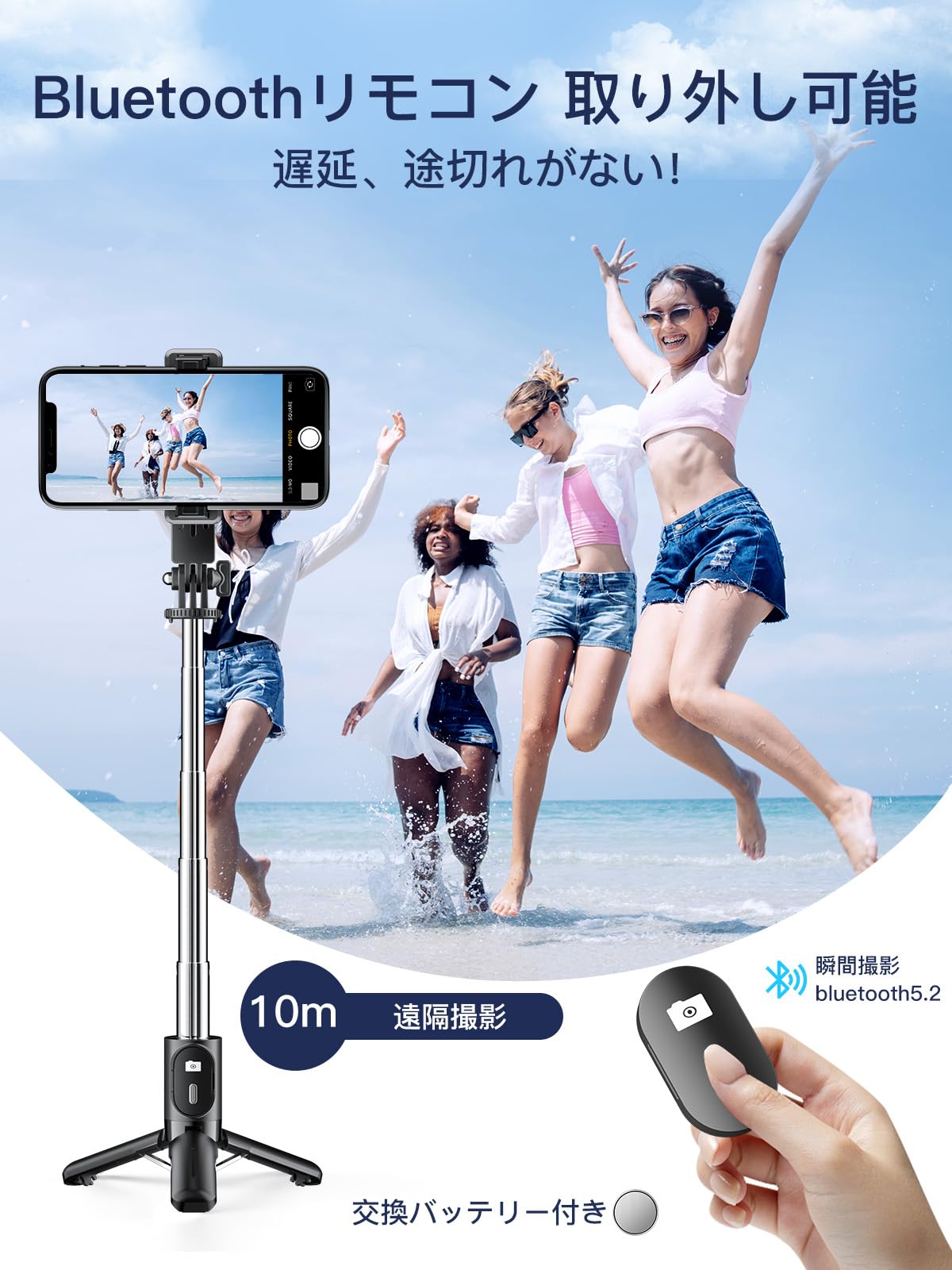 【0遅延で写真を撮れる】自撮り棒の無線リモコンは最先端ブルートゥース5.2技術を採用、通信範囲や伝送速度が大幅にアップするため、境に左右されない優れた接続安定性を実現していて、ワンタップですぐに撮れる、遅延、途切れがありません。10m遠隔撮影が対応、家族写真、一人旅など素晴らしい全身写真が実現できます。初心者にも簡単操作できる、初期接続が完了すると、セルカ棒のリモコンは電源をオフにしても設定が残ります。再度電源オンにして、自動で最後に接続されていたスマホへ瞬時接続を実現しました。*ブルートゥース機能が搭載されるAndroidとiOSのスマホに対応可能です。