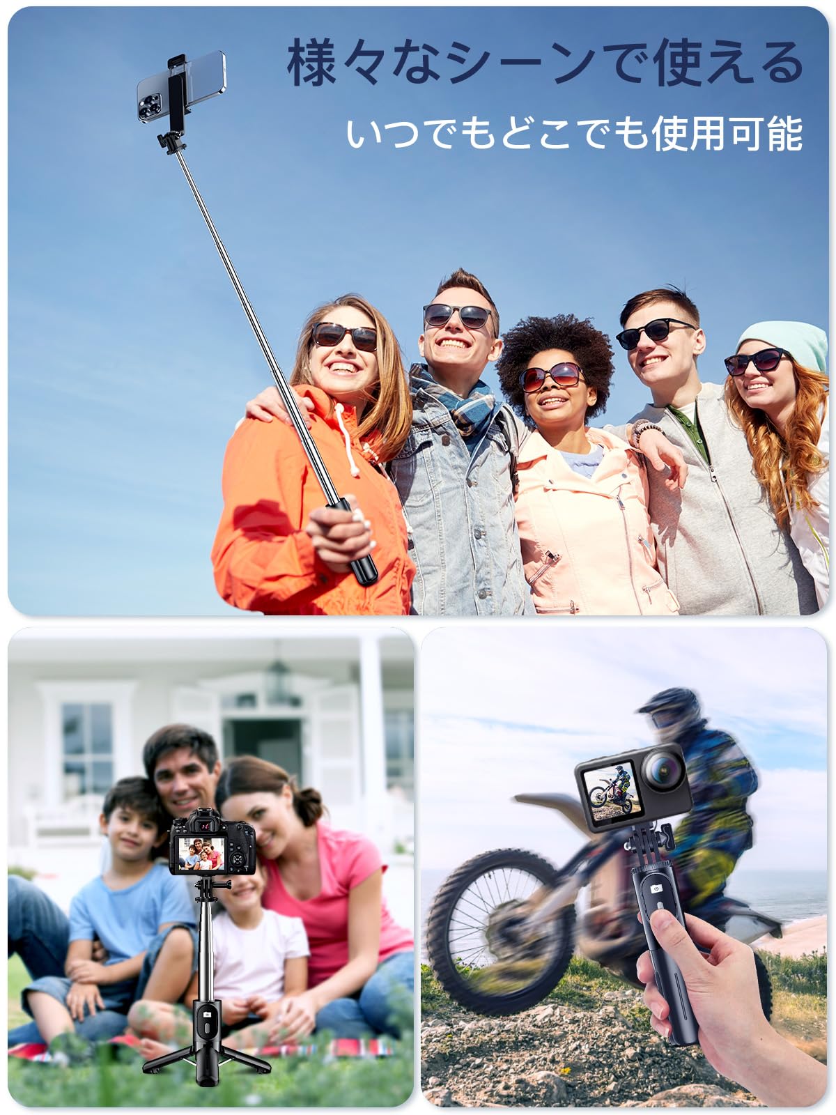 【4-in-1自撮り棒】自撮り棒は三脚を内蔵したタイプで、手持ちのセルフィーだけでなく、三脚 スマホスタンドとして動画鑑賞、集合写真、生放送、オンライン会議などにも適用です。用途の広いデザインにより、1/4ネジを付き、デジカメ用スタンド、アクションカメラ じどり棒、または生放送用リングライト 三脚としても使用できます。無期限のカスタマーサポートで、万が一製品に関する問題ありましたら、弊店にご連絡頂ければより早速に解策をご案内します!