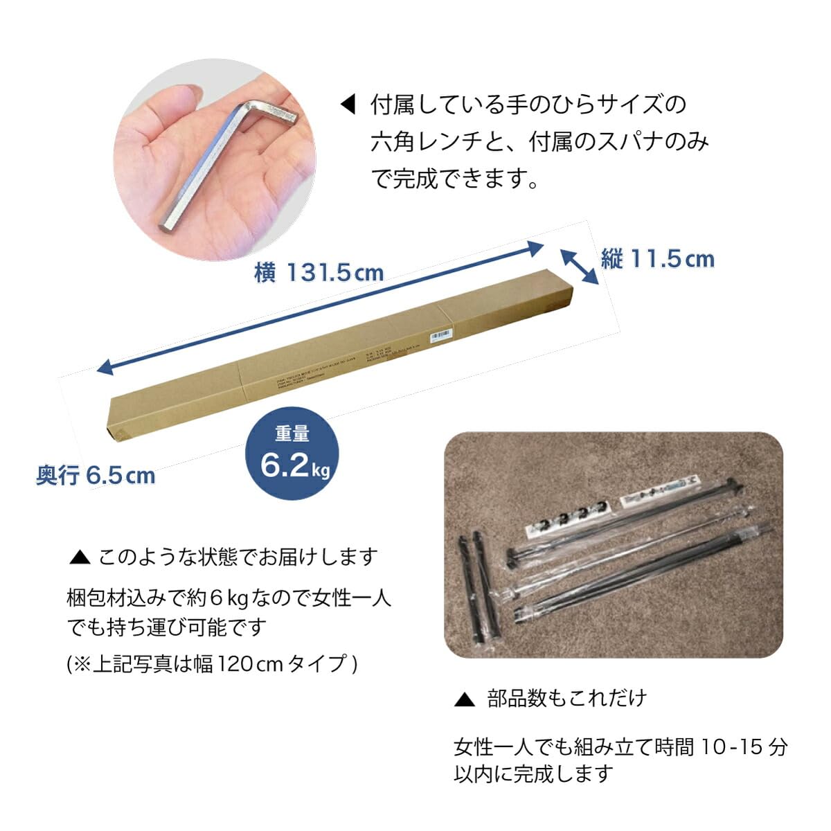 【商品詳細】[サイズ]幅:1296(柱芯々1200)mm×奥行:428mm×高さ:1090〜1740mm 内パイプ:φ22.2mm 外パイプ:φ25.4mm [材質]スチール製 上段:クロームメッキ 下段:黒(粉体塗装) [耐荷重]約150kg [本体重量]約5.1kg [製造国]台湾 [付属品]六角レンチ アジャスター