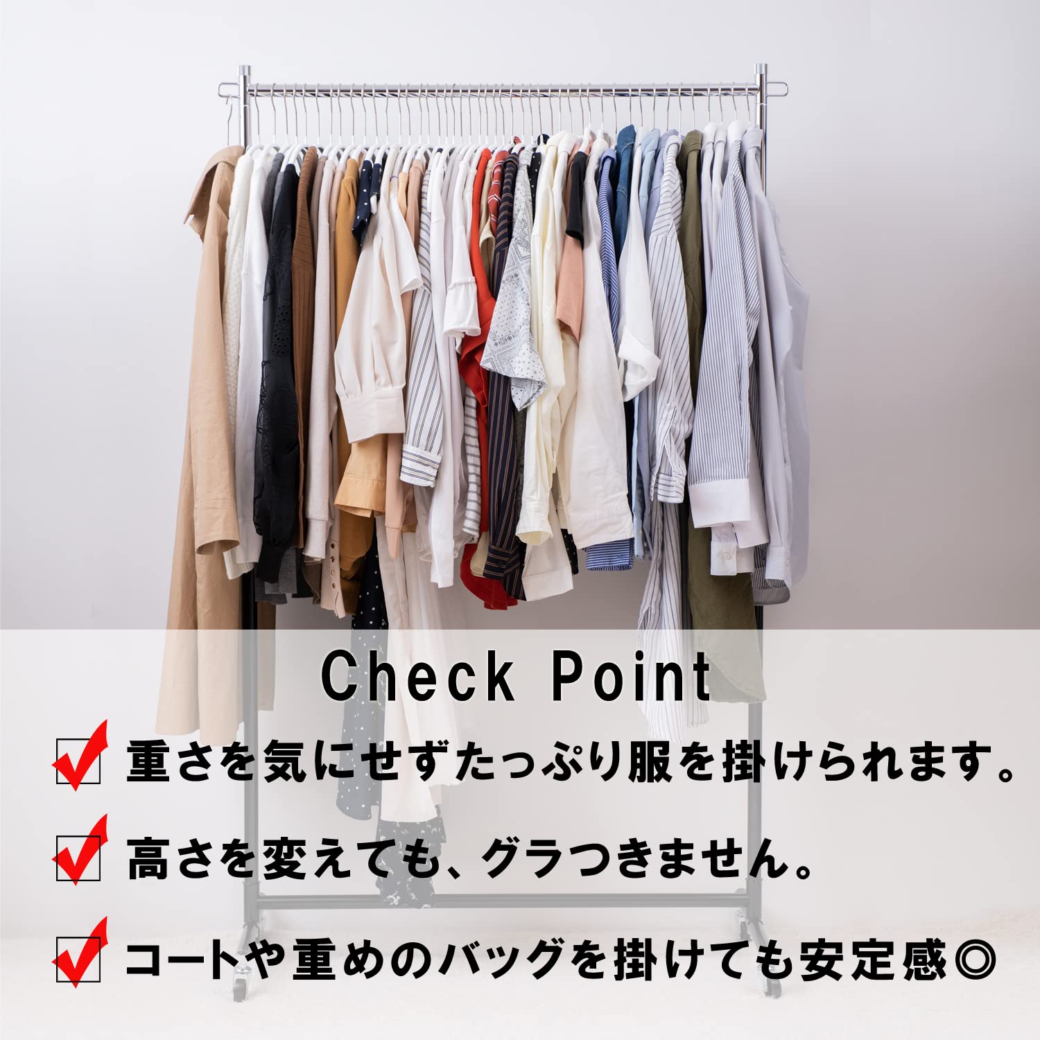 【高さ調節機能】高さは109cm〜174cmまで無段階で調整可能。ワンピースやロングコートなどの丈の長い衣類も掛けられます。高さを上げてもグラつかず、コートや重いバッグを掛けても安定感があります。