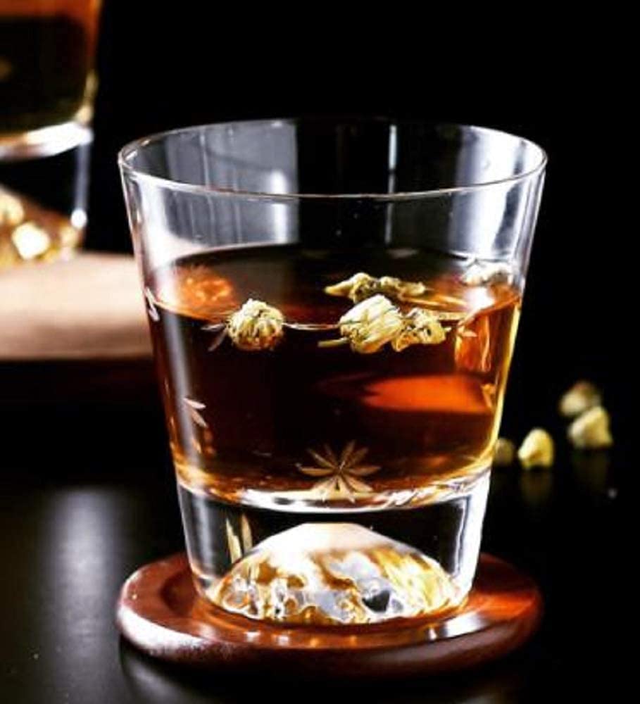 グラスの底にデザインされた富士山が、注ぐ飲み物の色によって様々に変化する様子が楽しいロックグラスです。