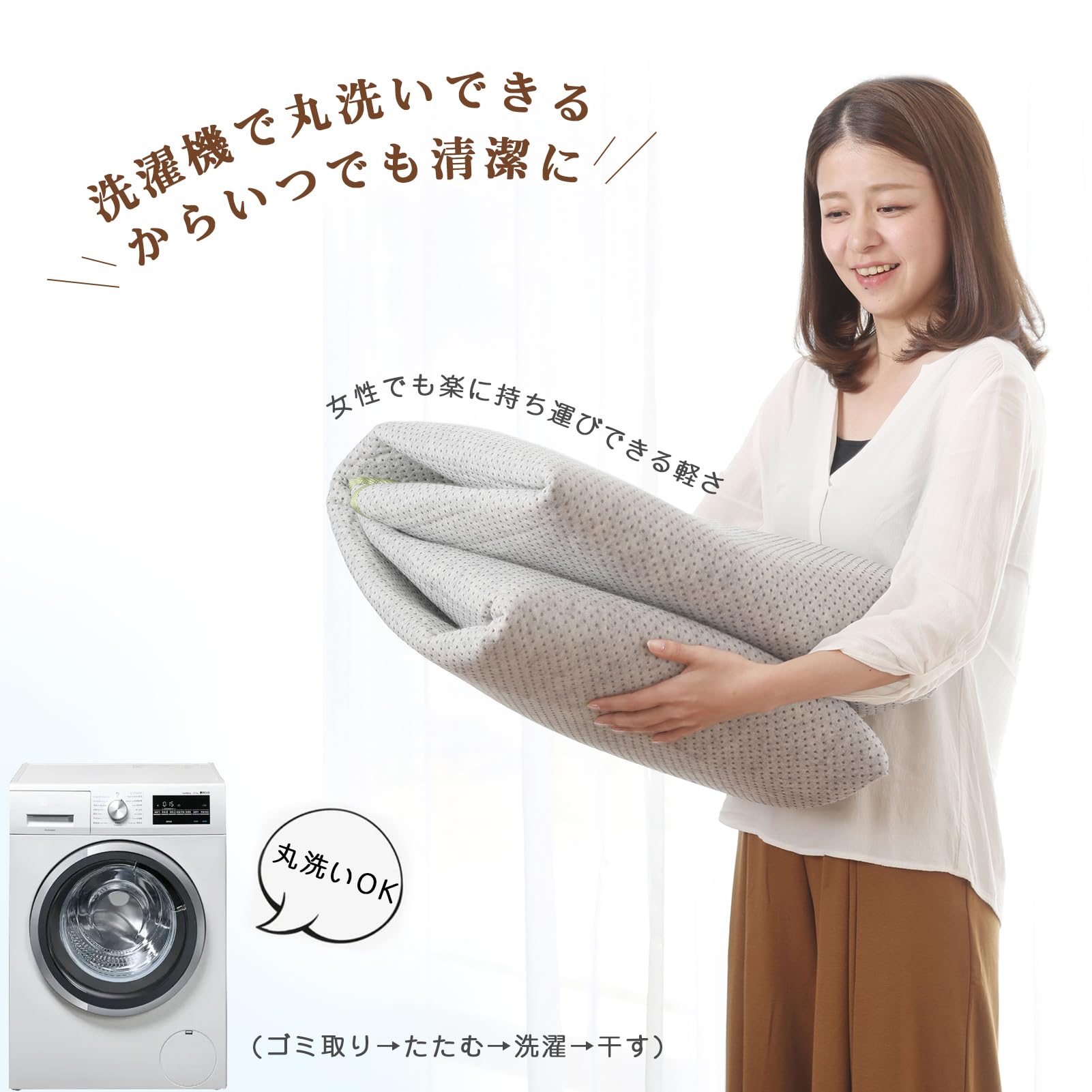 【丸洗いOK】使っていると気になる汚れも、ご家庭で丸洗いができます。密度が高くて短めの毛足はゴミが絡みにくく掃除機もかサやすい。※洗濯機洗いする際は洗濯用中性洗剤をご使用の上、必ず洗濯ネットに入れて裏側を内側にして洗ってください。洗濯機に入らない場合は無理に押し込まず、手洗いしてください。※洗濯後は直射日光を避けて風通しの良い所で陰干しをしてください。