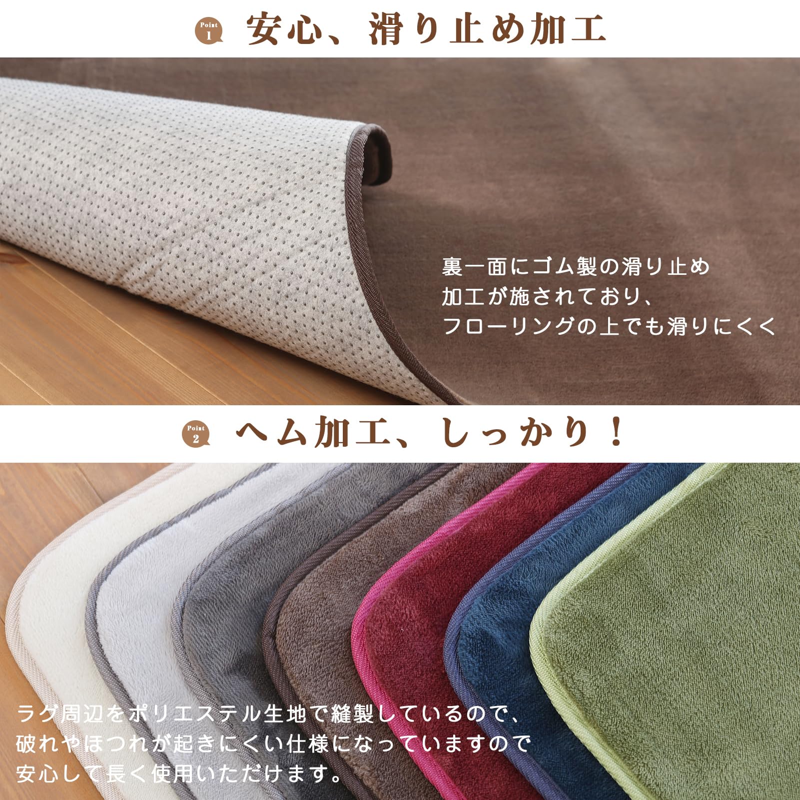【滑り止め加工】裏面にはゴム製の滑り止め加工が施してあり、フロリングに敷いても滑りにくく、お子さまやお年寄りのいるこ家庭でも安心です。