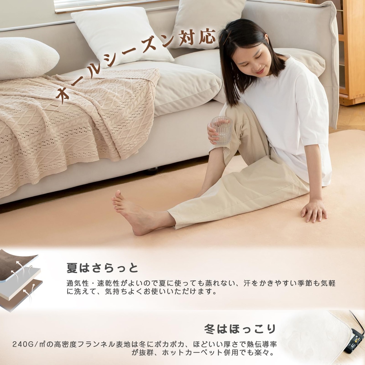 【オールシーズン対応】きめ細かく柔らかいマイクロファイバーを採用しますので、最高クラスのふわふわ感を実現します。このマイクロファイバーの優れている点は、軽くて保温性が高く、さらに速乾性に優れているため、夏はサラッと、冬はポカポカと床暖房・ホットカーペットも対応します。