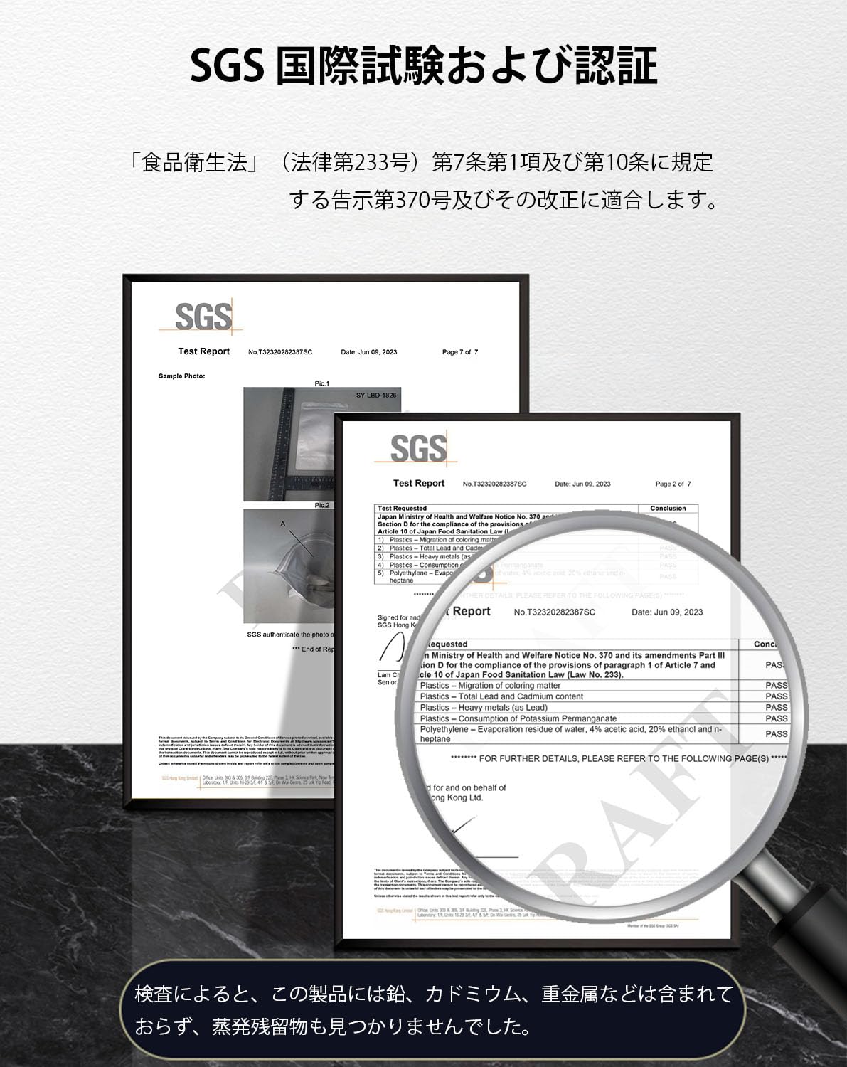 SGS国際試験・認証に合格し、日本の食品衛生法の基準に適合した製品です。