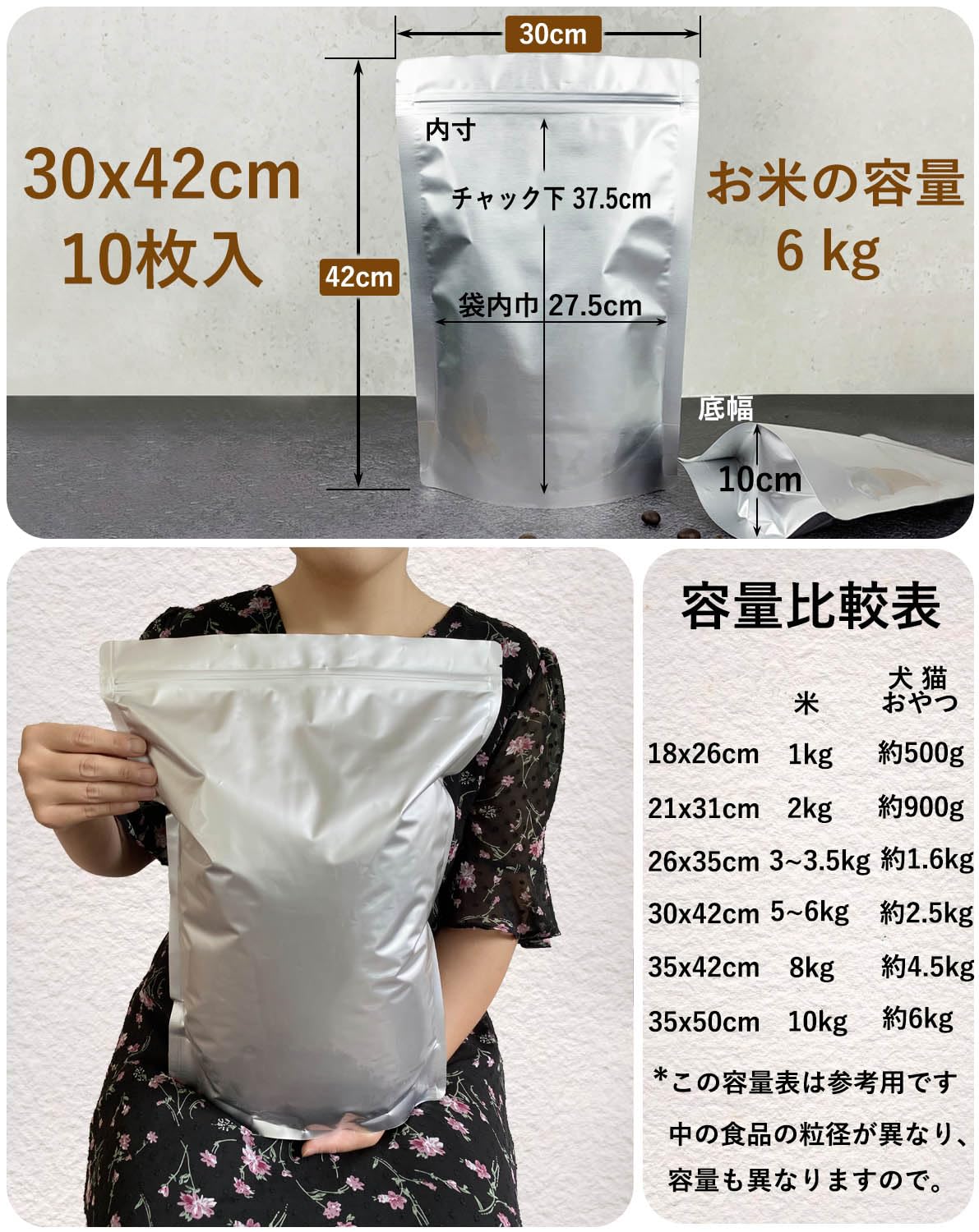 ?【鮮度を保つ3層構造】容量:米袋 5kg用、幅30 長さ42cm 10枚入。お米の鮮度を保つために、このお米保存袋はアルミ、PET、PEの三層構造で作られています。光や空気、臭いを徹底的に遮断し、お米の美味しさを長期間保つことができます。