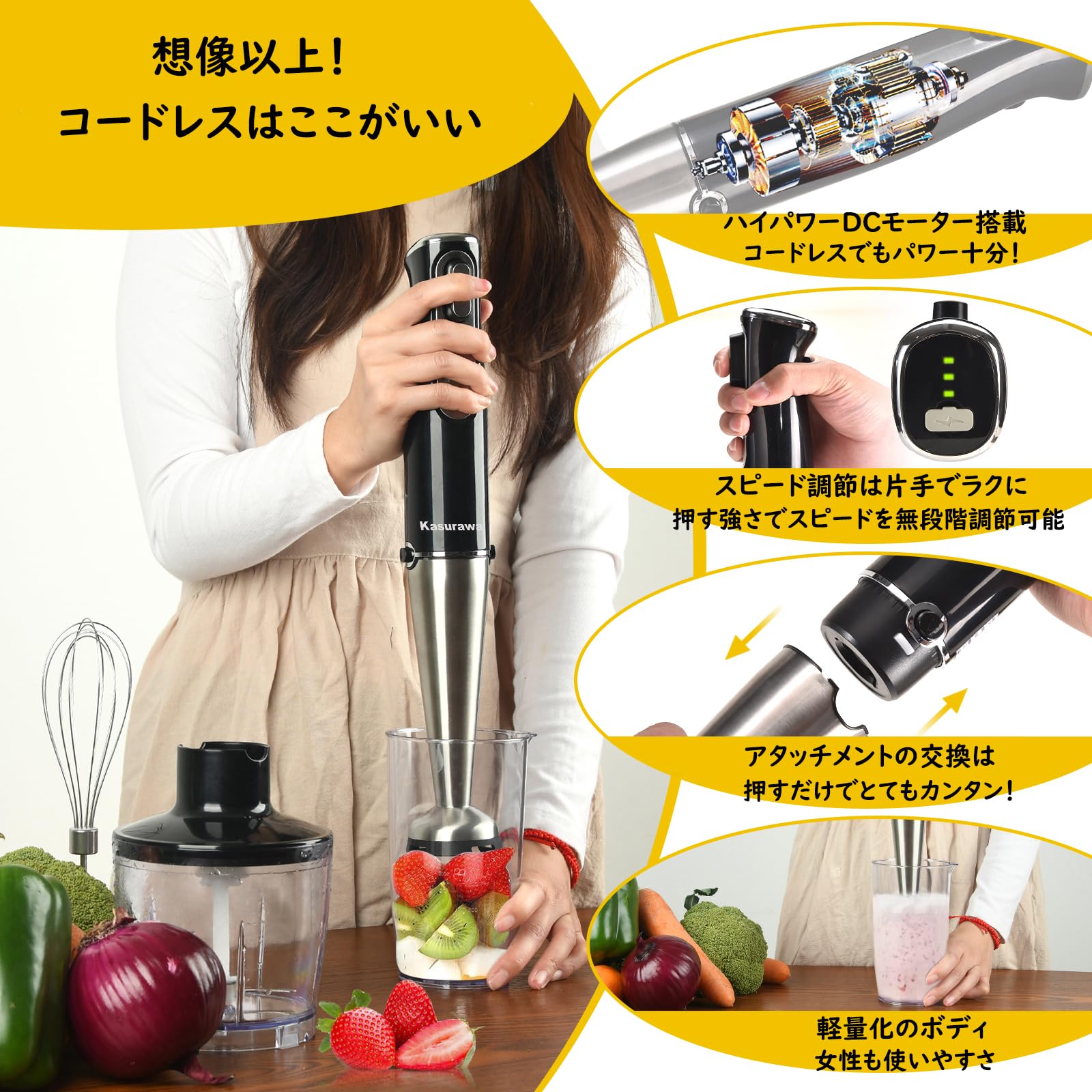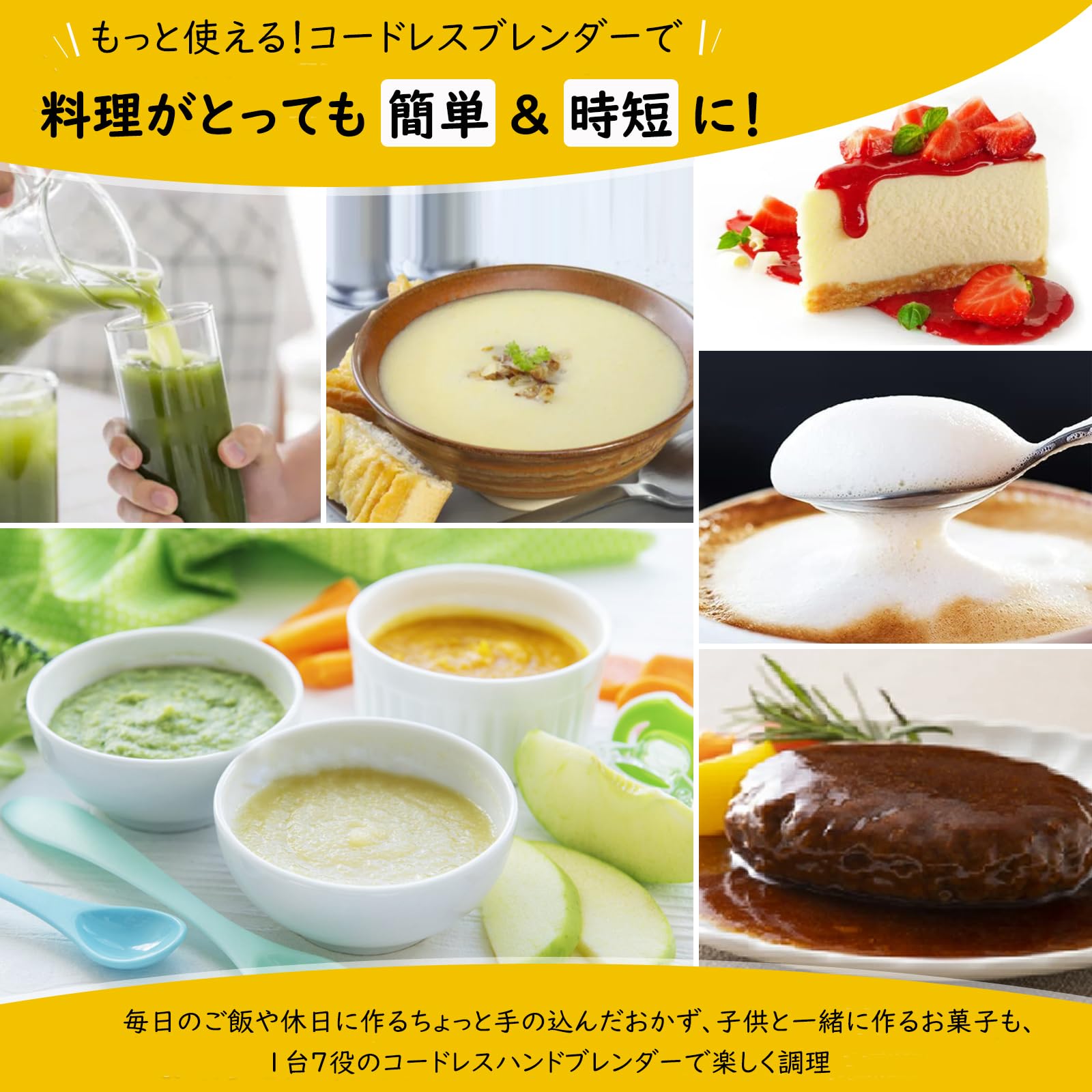【数量限】ハンドブレンダー 場所を選ばず使えて便利 コードレスハンドブレンダー 充電式 ブレンダー 無段階変速 1台7役 ミキサー フードプロセッサー 泡立て器のまとめ 調理器具 下ごしらえ スムージー スープ つぶす 混ぜる きざむ みじん切り 泡立てる簡単操作 収納&お手入れも簡単 鍋キズ防止 ハイパワーで氷も砕ける 料理時短