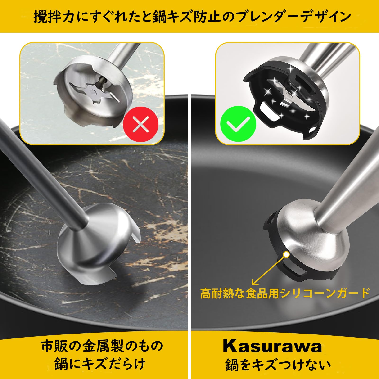 『鍋やボウルに直接使える&飛び散り防止するのブレンダーデザイン』従来の鋭い金属製の保護カバーに代わり、高耐熱な食品用樹脂素材の保護カバーを付きますので、鍋肌を傷つけず、直接に使えます。調理の時短にもなり、洗い物が増えません。周囲が汚れにくい、飛び散り防止設計も魅力です。料理の時短を通じて、すべてのお母さんを応援します。
