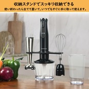 『充実のアタッチメントで1台7役』アタッチメントの付替えで、つぶす・混ぜる・泡立てる・かき混ぜる・みじん切り・ミンチ・ミルクフローサーなど時短調理に便利。「料理の手間や時間はなるべく減らしたい…」「野菜が摂れるスープやスムージーを作りたいけれど面倒…」「本格的な料理を作りたいけれど行程が難しい…」などなど調理ストレスがこのハンドブレンダーなら解決できます!