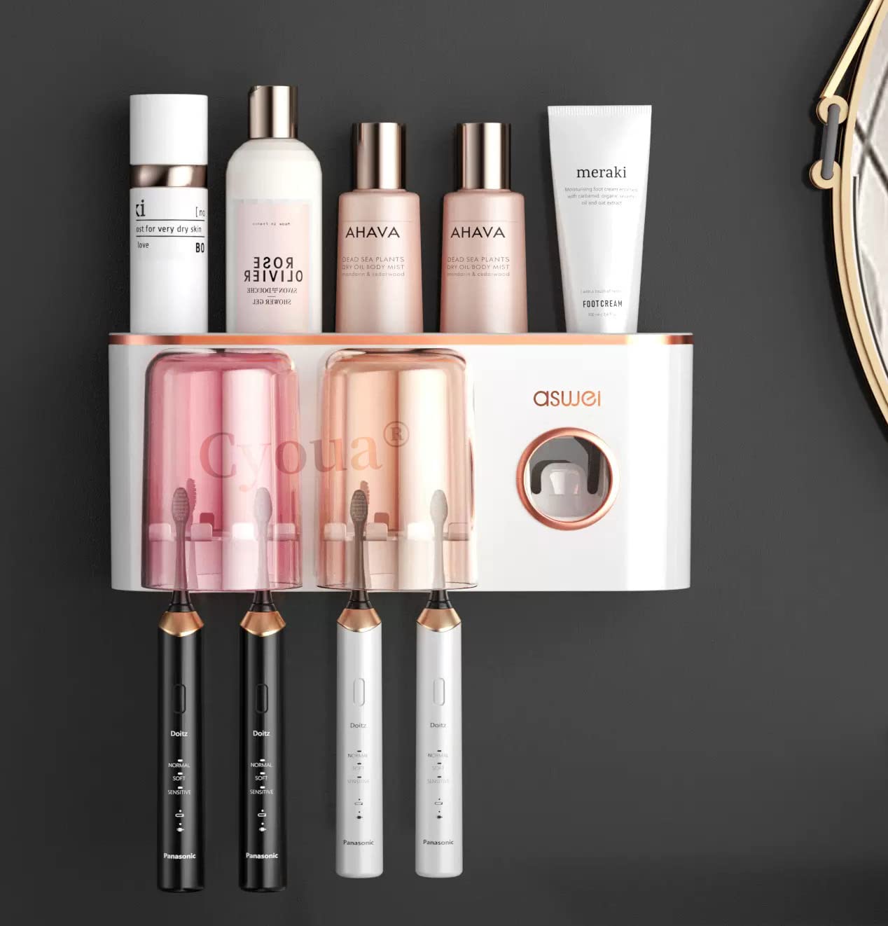 【在庫処分】歯ブラシスタンド 歯ブラシホルダー 壁掛け おしゃれ 歯ブラシ立て コップ立て 歯ブラシたて 浮かせる 自動歯磨き粉ディスペンサー 自動歯磨き粉絞り器 歯磨き コップ 洗面所 収納 衛生 トイレタリー収納 多機能 穴あけ不要 うがいコップ 衛生 2人家族 (歯磨きコップ×2) | GIGATERA