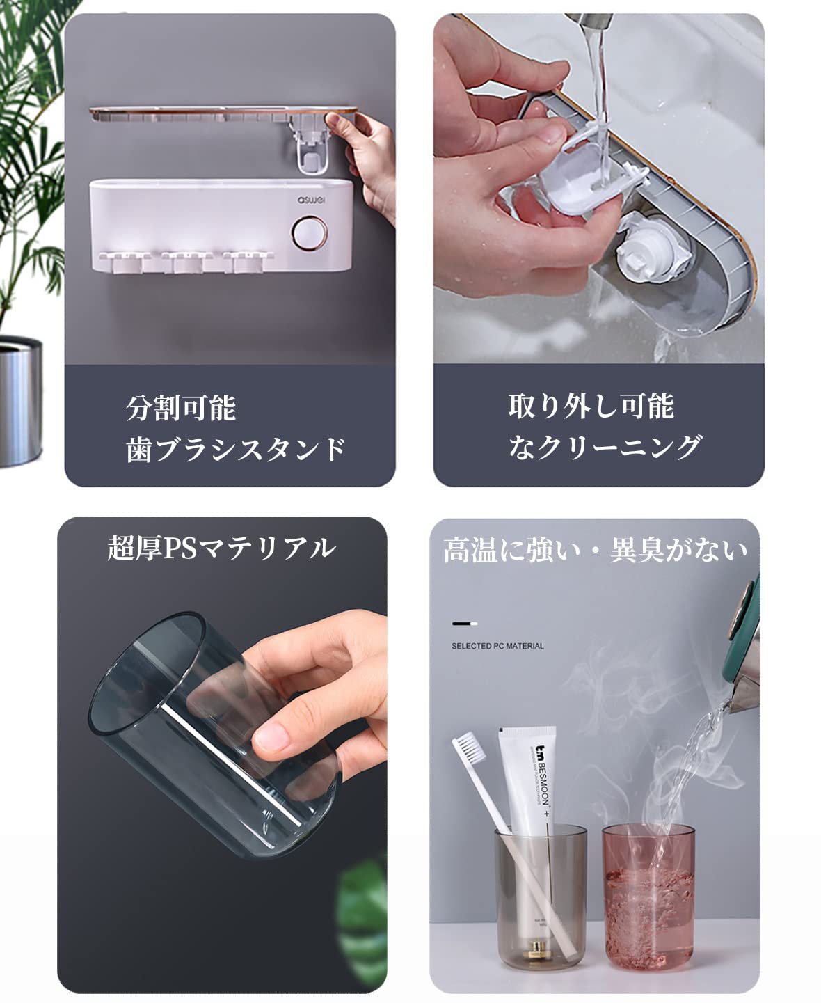 【合理的な設計】カップホルダーを倒すことで、ほこりや水分の急速な排出を防ぐことができます。歯ブラシとコップを清潔に保ち、安全で健康な生活を実現し、細菌の繁殖を防止する。プノンペンの贅沢なデザインは格調があって、透明なコップはカップの中の様子が見えて、同時に色もとてもきれいです!高品質ABS素材、無毒、無味、丈夫で耐久性、耐久性。 バスルームラック、キッチンラック、コーナーラックとして、バスルーム、洗面台、トイレなど様々な場所で使用できます。