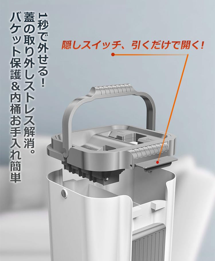 【バケツ・モップ絞り器付き】バケツはウェットとドライの分離が特徴で、モップを別々に洗って乾かします。 手を汚れから遠ざけてください。 内蔵のウォッシュスクイージーは、モップの毛やゴミをきれいにし、清潔さを確保し、乾いた部分は床の掃除中にモップパッドの適切な水分レベルを維持し。モップヘッドは折りたたむことができ、バケツの入り口に直接差し込んで収納することができ、スペースを節約し、乾燥しやすい。