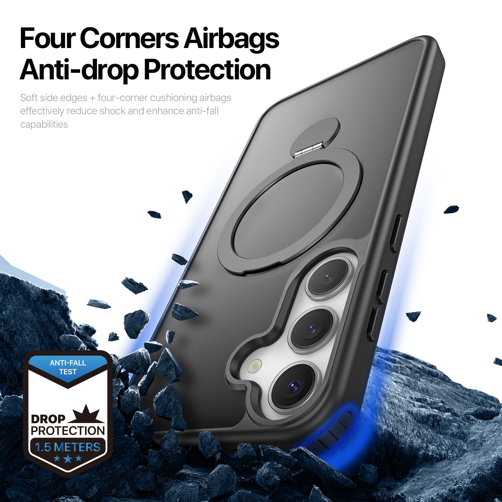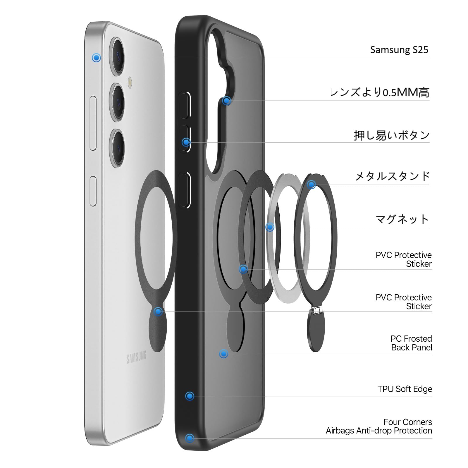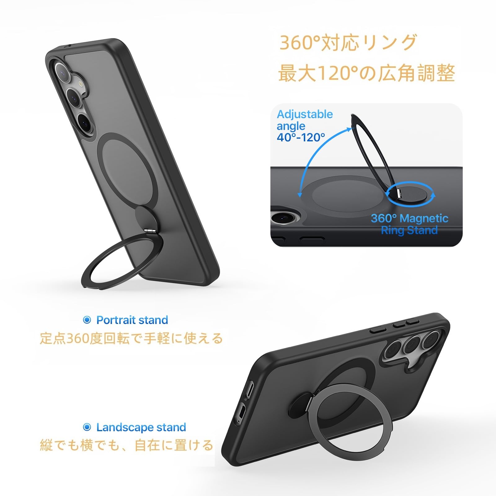 Galaxy S25 / SC-51F / SCG31 用 ケース 定点360°回転スタンド MagSafe対応 ギャラクシーs25 カバー ワイヤレス充電 SUGOIDAN 携帯ケース リング ぎゃらくしーs25 ケース 半透明 マグセーフ 軽量 スマホケース (ブラック)
