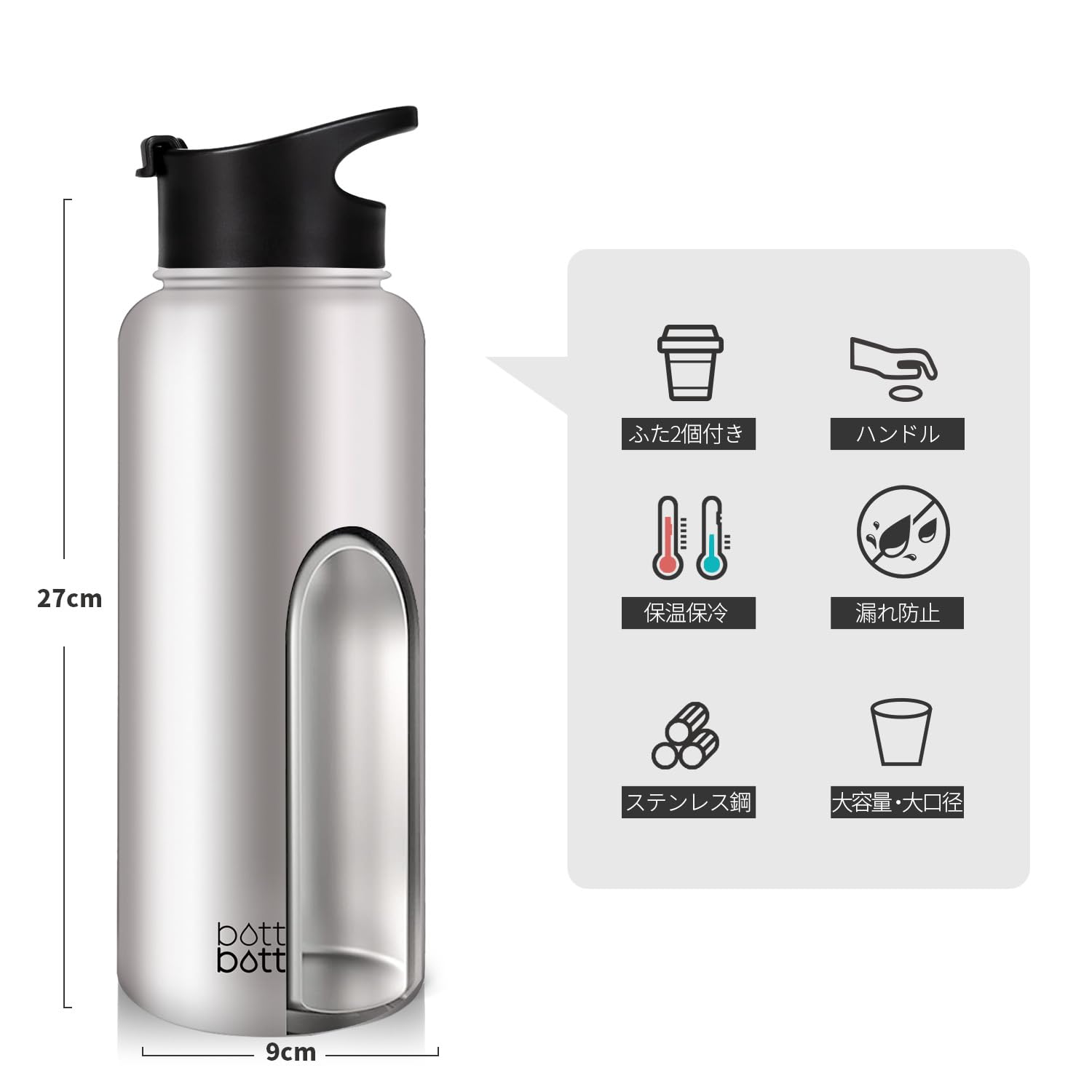 水筒 1000ml 保冷 ステンレスボトル 真空断熱 まほうびん 持ち運び便利 2点フタ付き 直飲み マグボトル アウトドア スポーツ bottlebottle シルバー