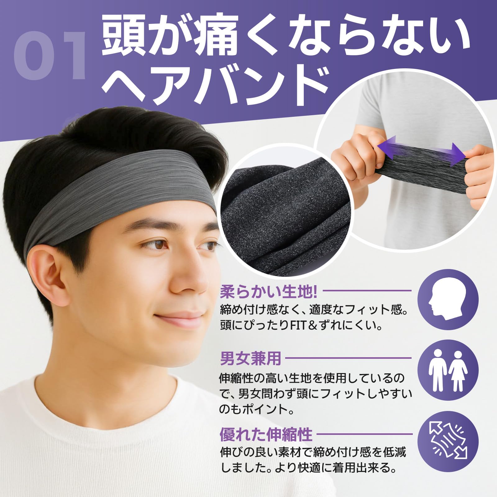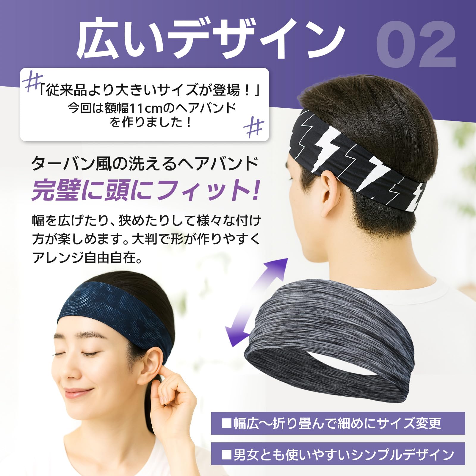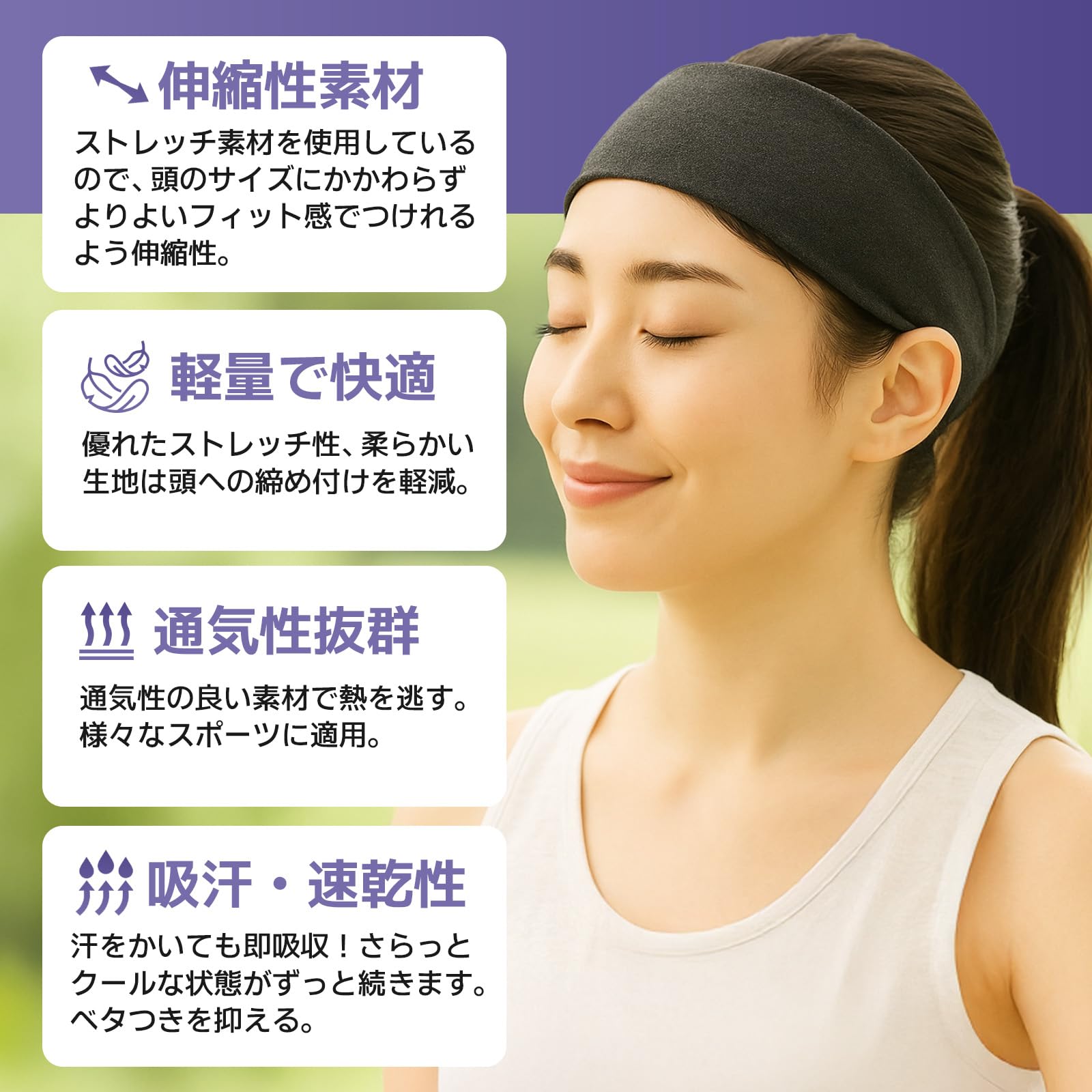 トレーニングやエクササイズ、競技やレース、あらゆるたくさんの汗をかくシーンでも、目に汗が入らないヘッドバンド。様々なスポーツ、ジョギングやウォーキング、ジムでのトレーニングなど、あらゆるアクティブシーンに最適なヘアバンド!