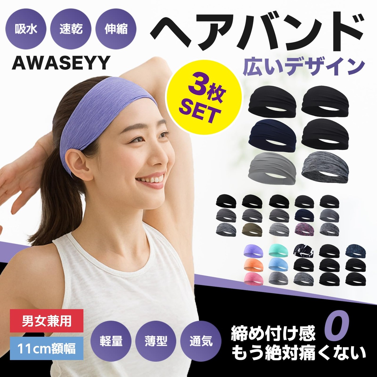 【数量限】ヘアバンド メンズ ヘッドバンド スポーツ 幅11cm 帽子インナー 汗止め ヘアターバン バンダナ カチューシャ 汗止めバンド 吸汗速乾 広幅 薄型 伸縮性 サラサラ ジョギング 野球 サッカー 運動用 ターバンヘアバンド 男女兼用 3色セット