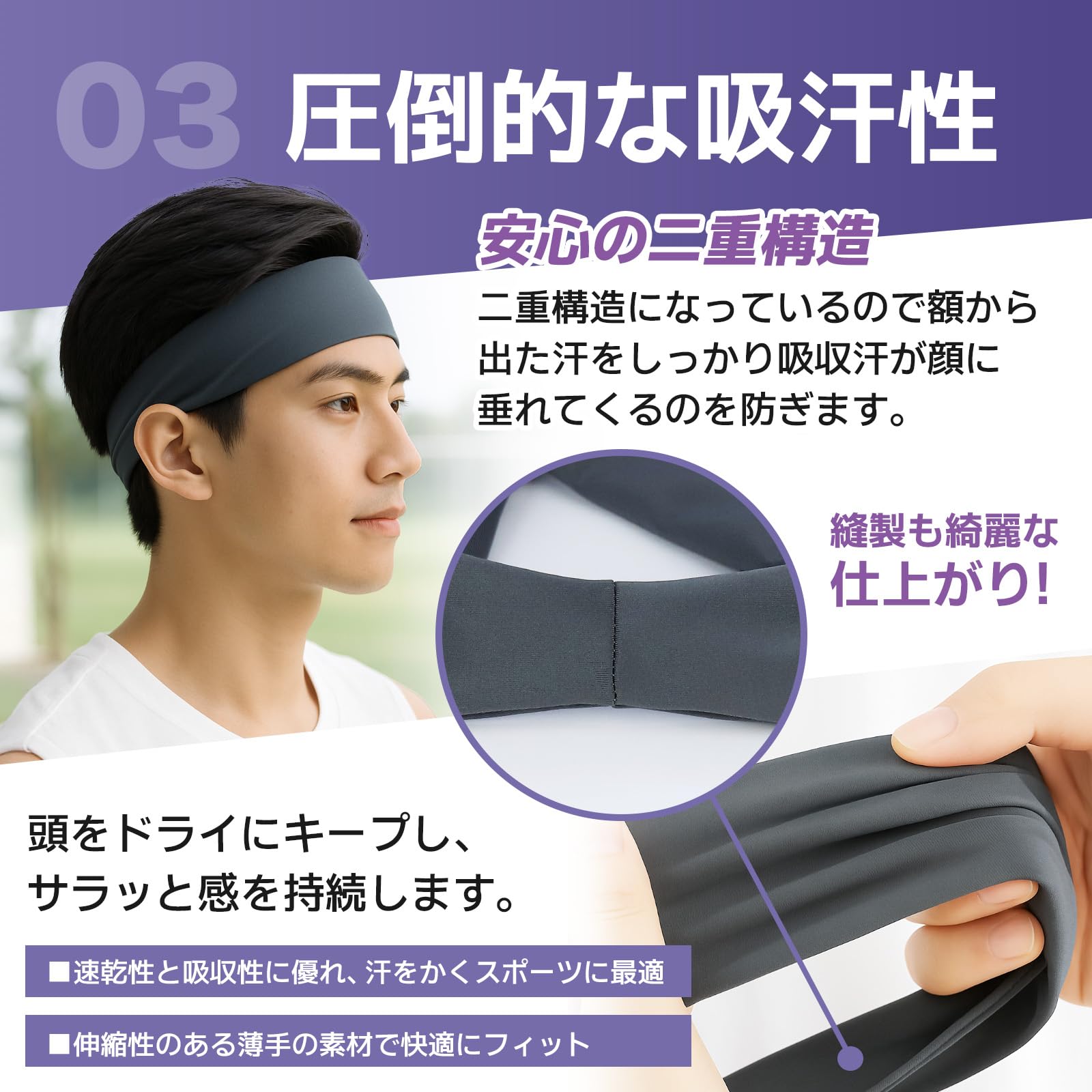 「吸汗性能」運動時に気になる額の汗を素早く吸収する、抜群の吸汗性能!汗止め効果も抜群なので額から汗が流れ落ちる不快感もなく、しっかりと運動に集中できます。