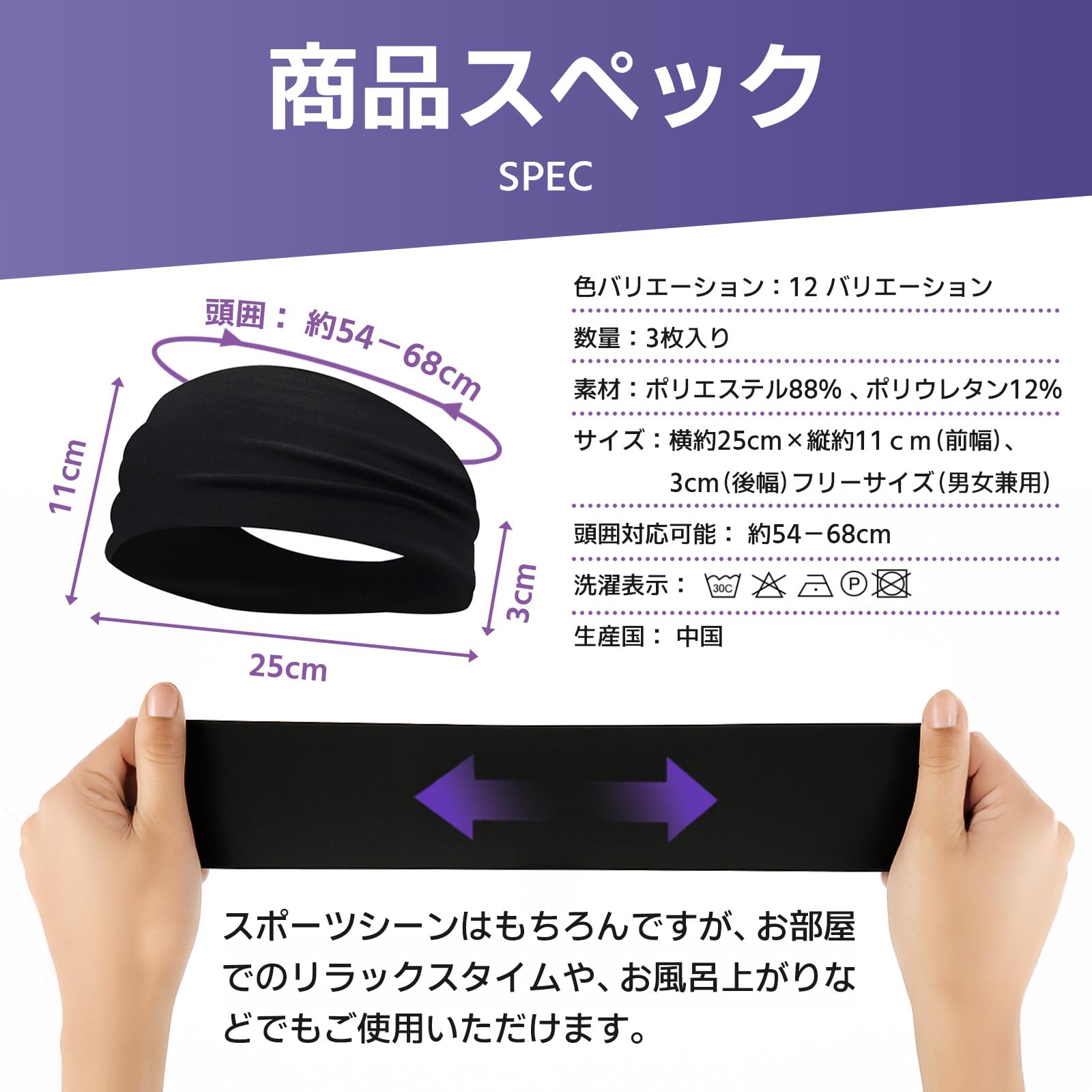 「伸縮性」適度な伸縮性なので、ダンスやランニングなど激しい運動でもズレたりせず、ピッタリとフィット!重さも感じないため付け心地も良く、あらゆるスポーツに最適なヘアバンドです。