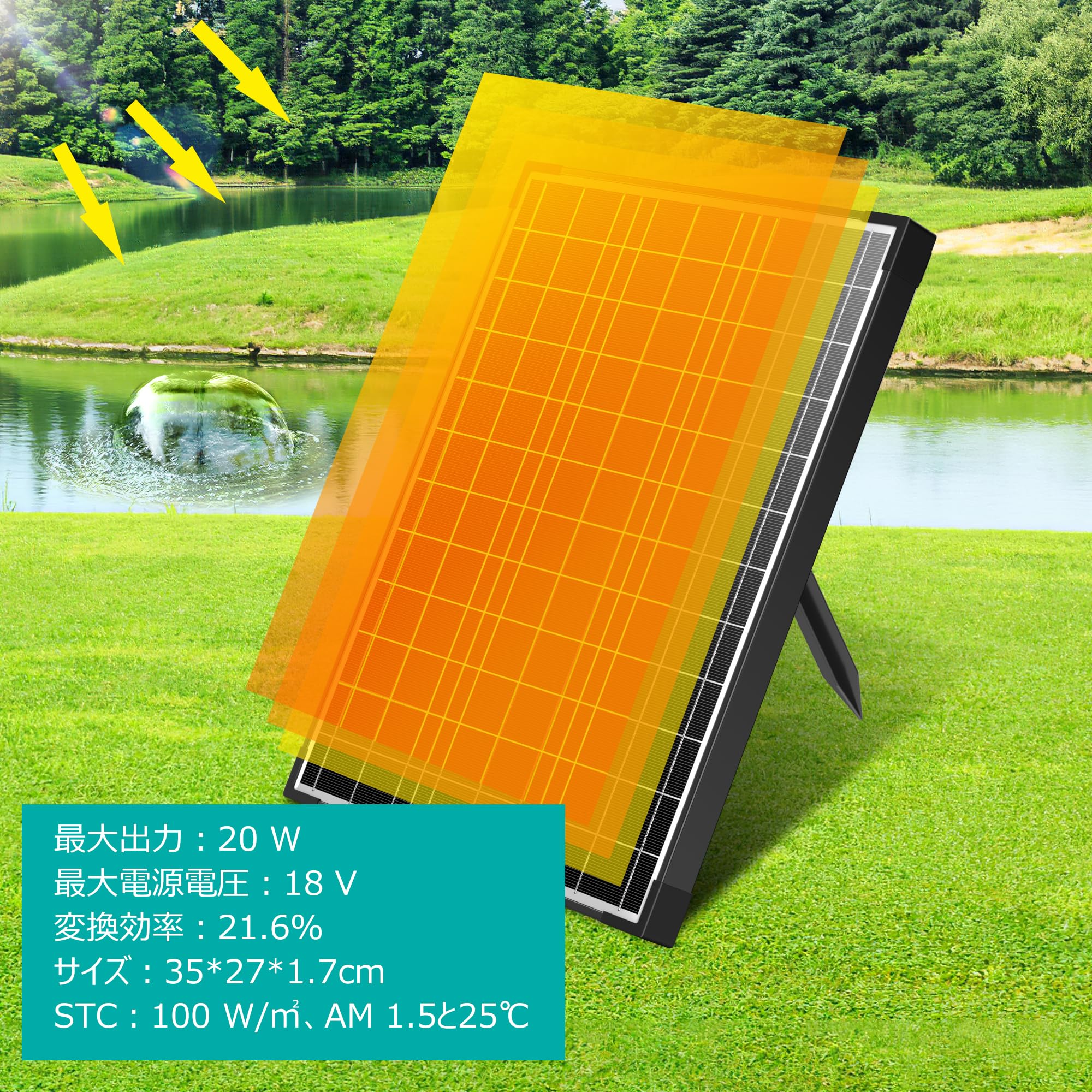 【充電電池無し】ソーラーポンプは充電電池なし、太陽光でダイレクトドライブ動作でございます。ソーラーパネルは必ず直射日光に当たる所に設置してください。