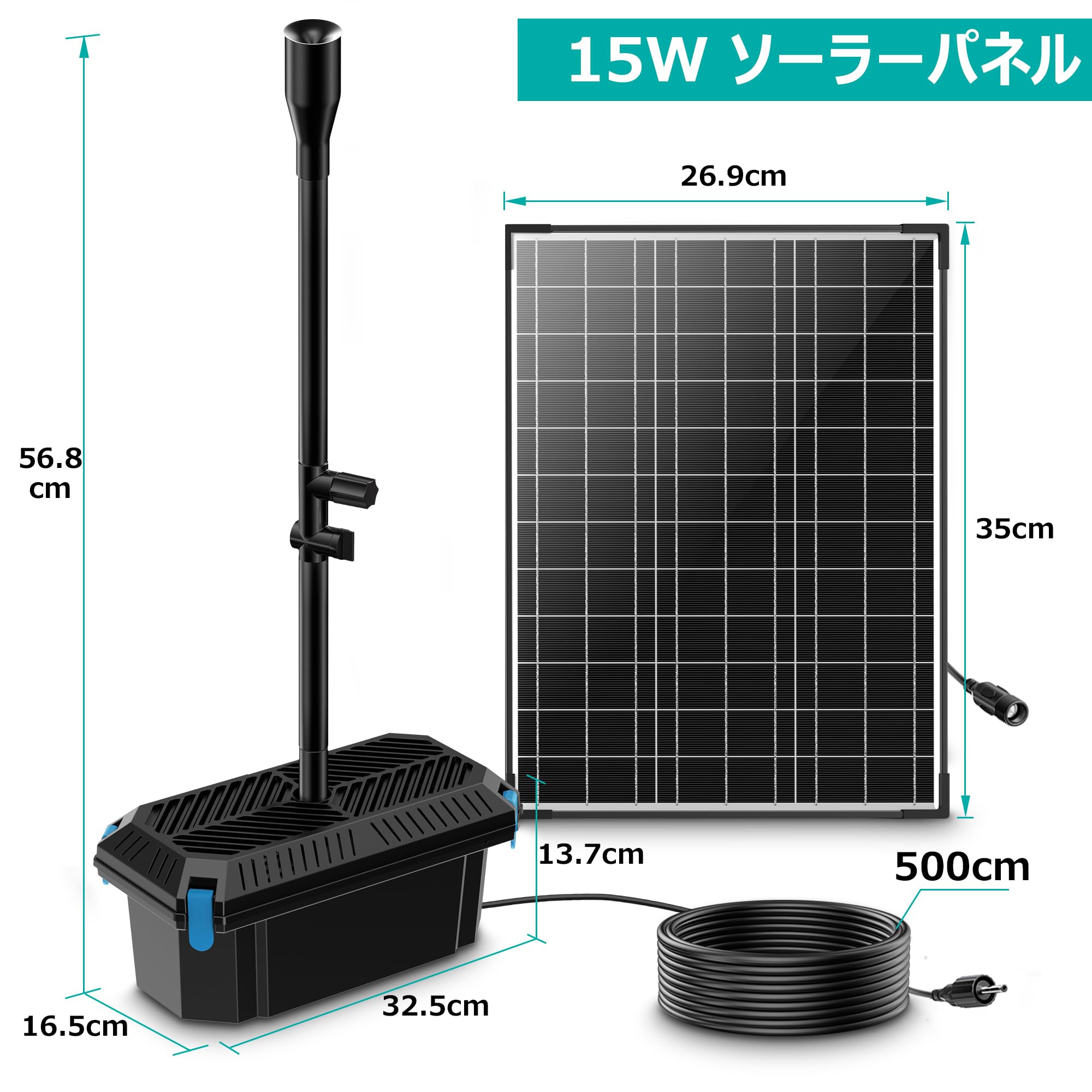 【ソーラー充電】大きな15Wソーラーパネル付きで配線不要です。屋外で水の循環に最適です。フィルターボックスは水中の細かいゴミを濾過され、ポンプキットの定期メンテナンス時間を3?5倍延長することができます。