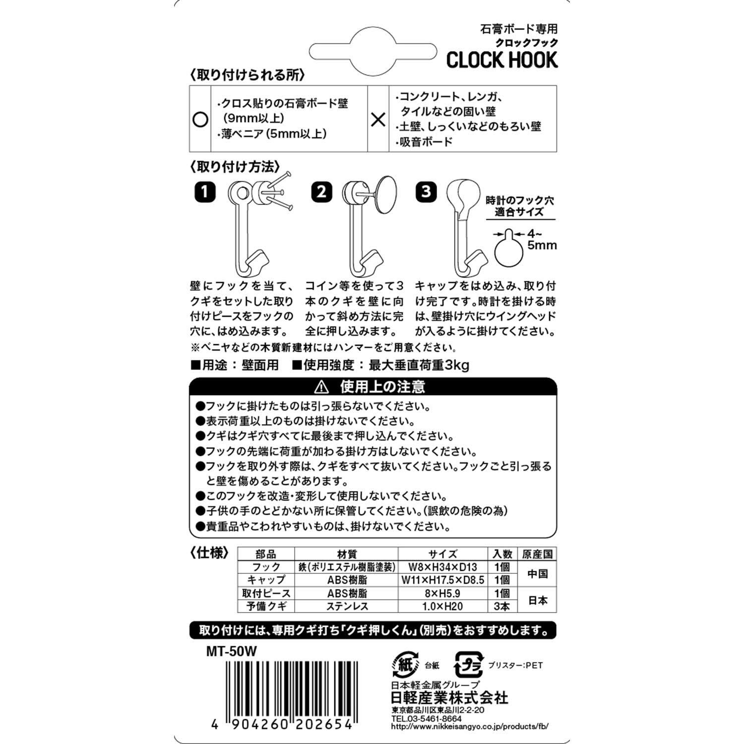日軽産業 フック クロックフック MT-50W 奥行1.3×高さ3.4×幅0.8cm キャップ1個、取付ピース1個、予備クギ3本 0523-255
