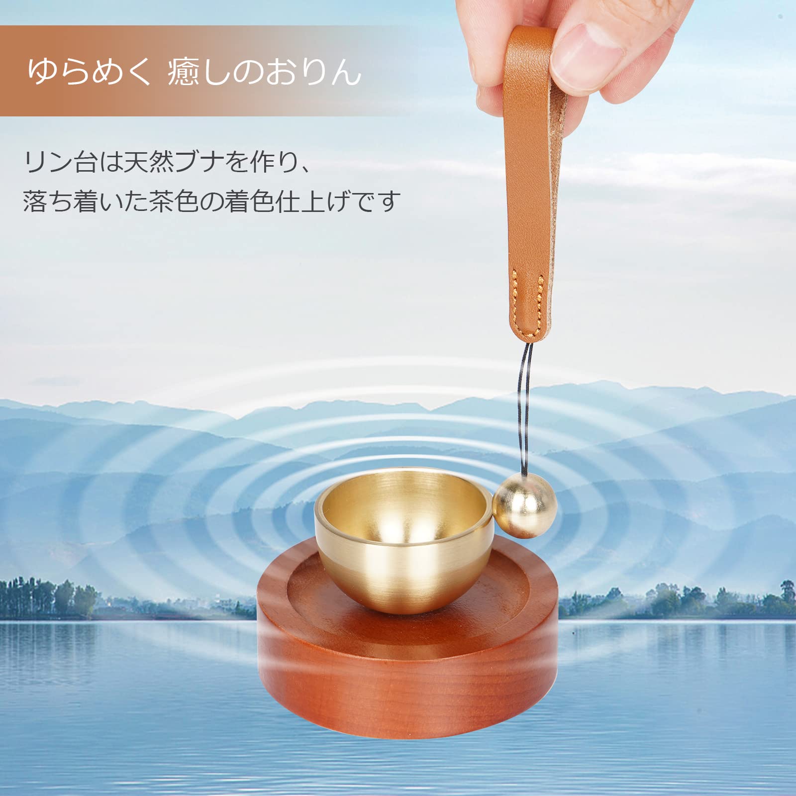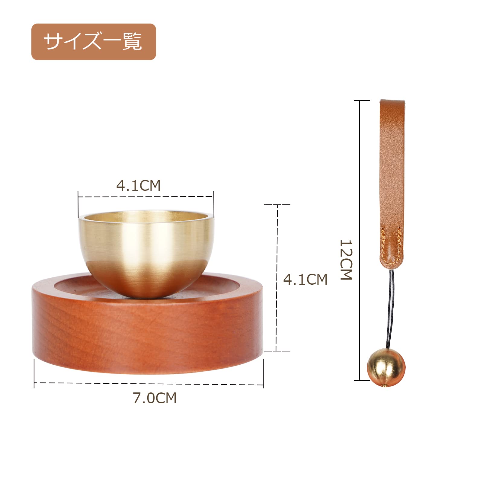【おりんのサイズ&材質】高さ4.1cm×直径7.0cm おりん(真鍮)*1 りん棒(真鍮)*1 台座(天然木)*1※全て手作業で作られており、天然木を使用しているため、木目等仕上がりが個々で違います。