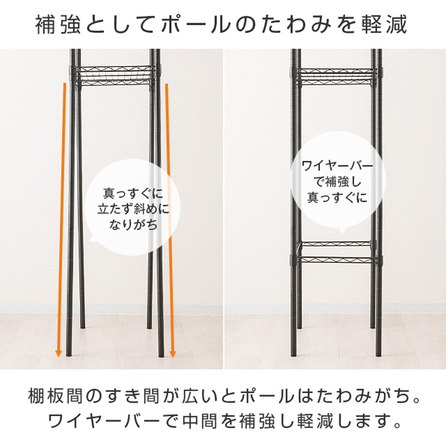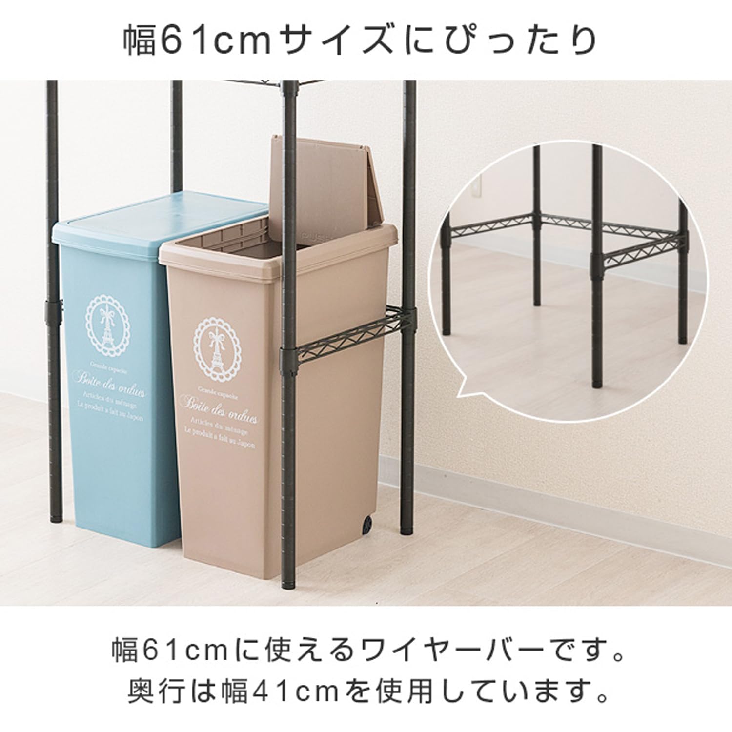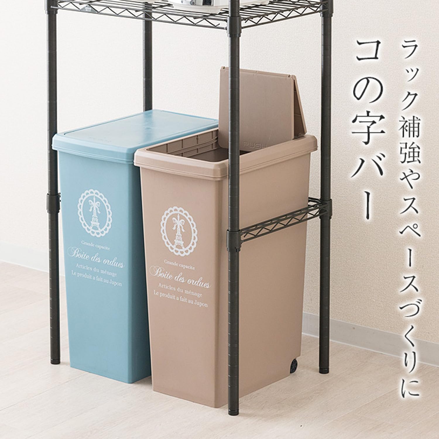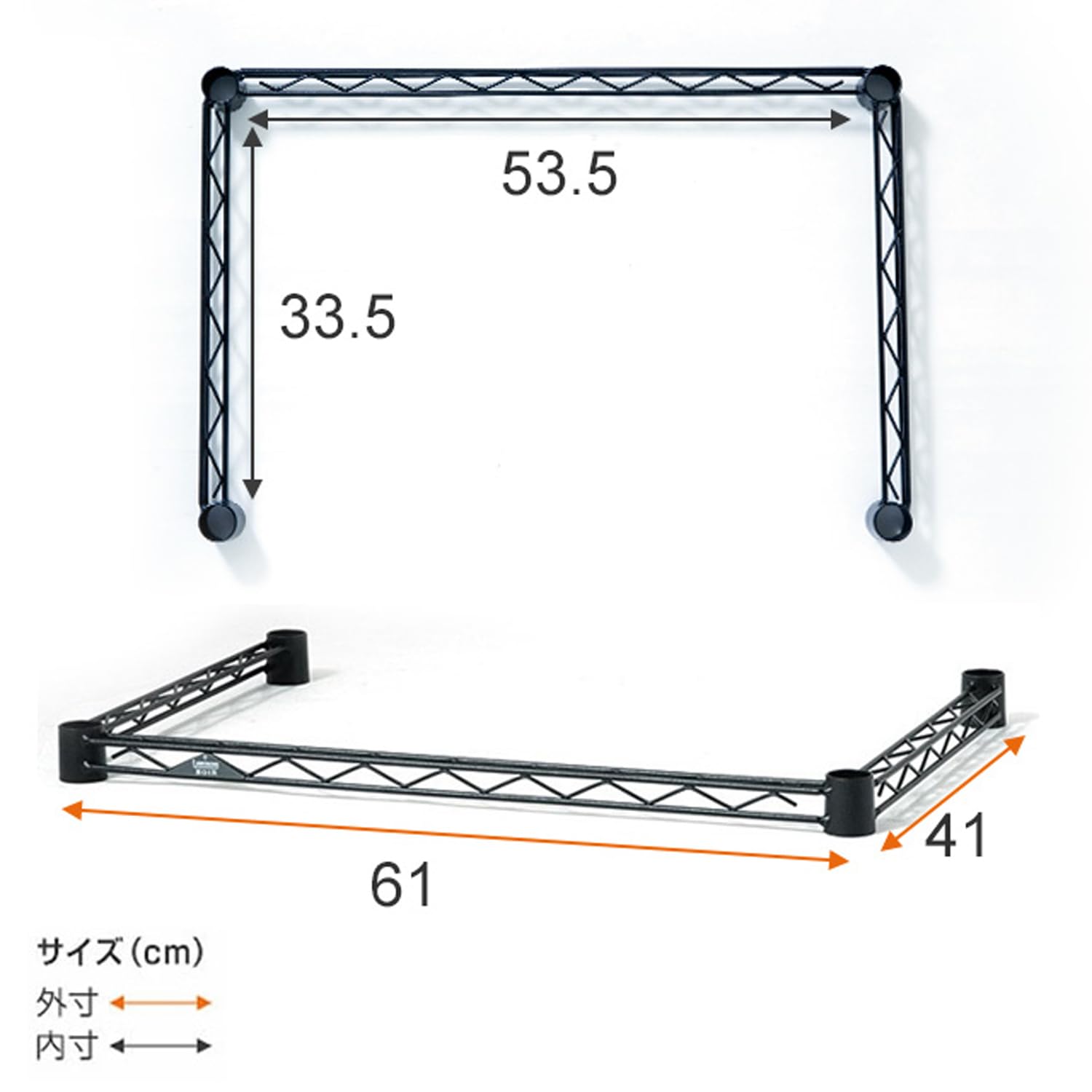 【特価在庫】ドウシシャ ルミナス ノワール スチールラック 補強追加パーツ コの字バー ワイヤーバー 黒 幅61×奥行41cm NOKWB-6040 ポール径25mm スリーブ4個付き 落下防止柵 引掛け収納 頑丈 グラつき防止 幅60モデル ゴミ箱上ラック | GIGATERA
