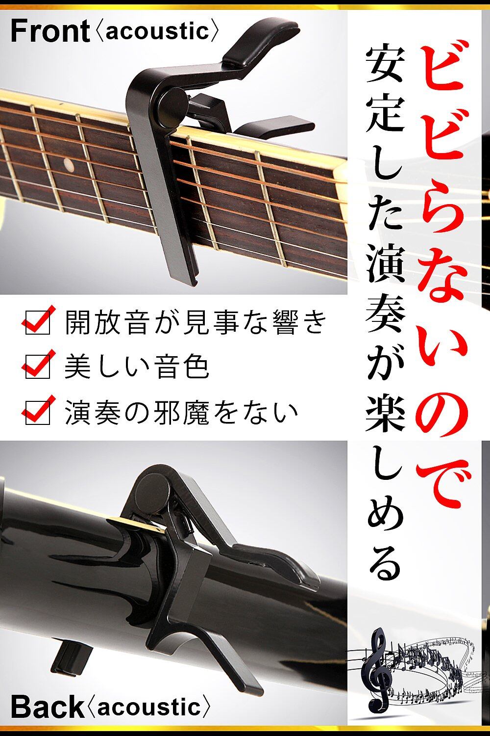? 【強力ホールド】強力なバネで弦をしっかりHOLDビビり無し!カポタスト選びでありがちな失敗は、全ての弦が正しくホールドされず本来の音が出ないことです。これは演奏を台無しにしてしまう致命的な欠陥!しかしType-Rは内蔵の強力なバネが細い1弦まで確実に押さえ、必ずあなたが納得する美しき音色を響かせることをお約束します。