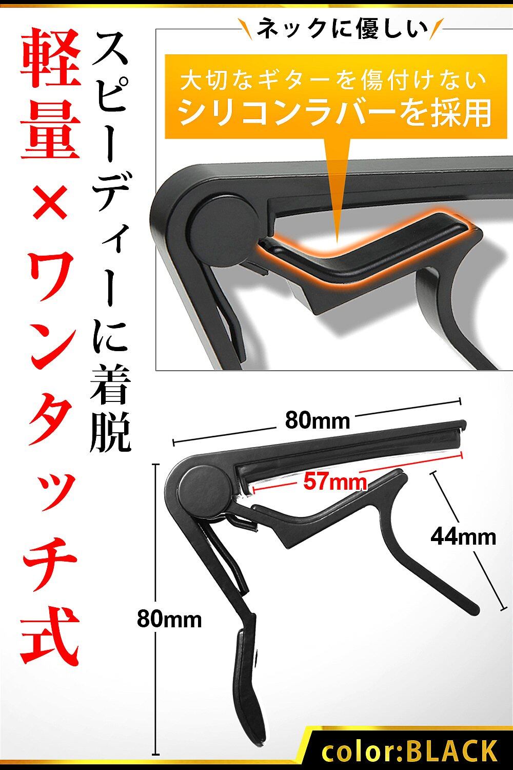 ? 【簡単着脱】カポタスト本体をネックに挟むだけで簡単に装着!ここぞという時に使うカポタストですが、ワンタッチで脱着できるのでとってもスムーズSo Good♪ 使わない間はギターヘッドに挟んでおけばストレス無く素早いセットが可能!また、指板面・ネック面にはシリコンを使用しており大切なギターを傷付けることがありません^^