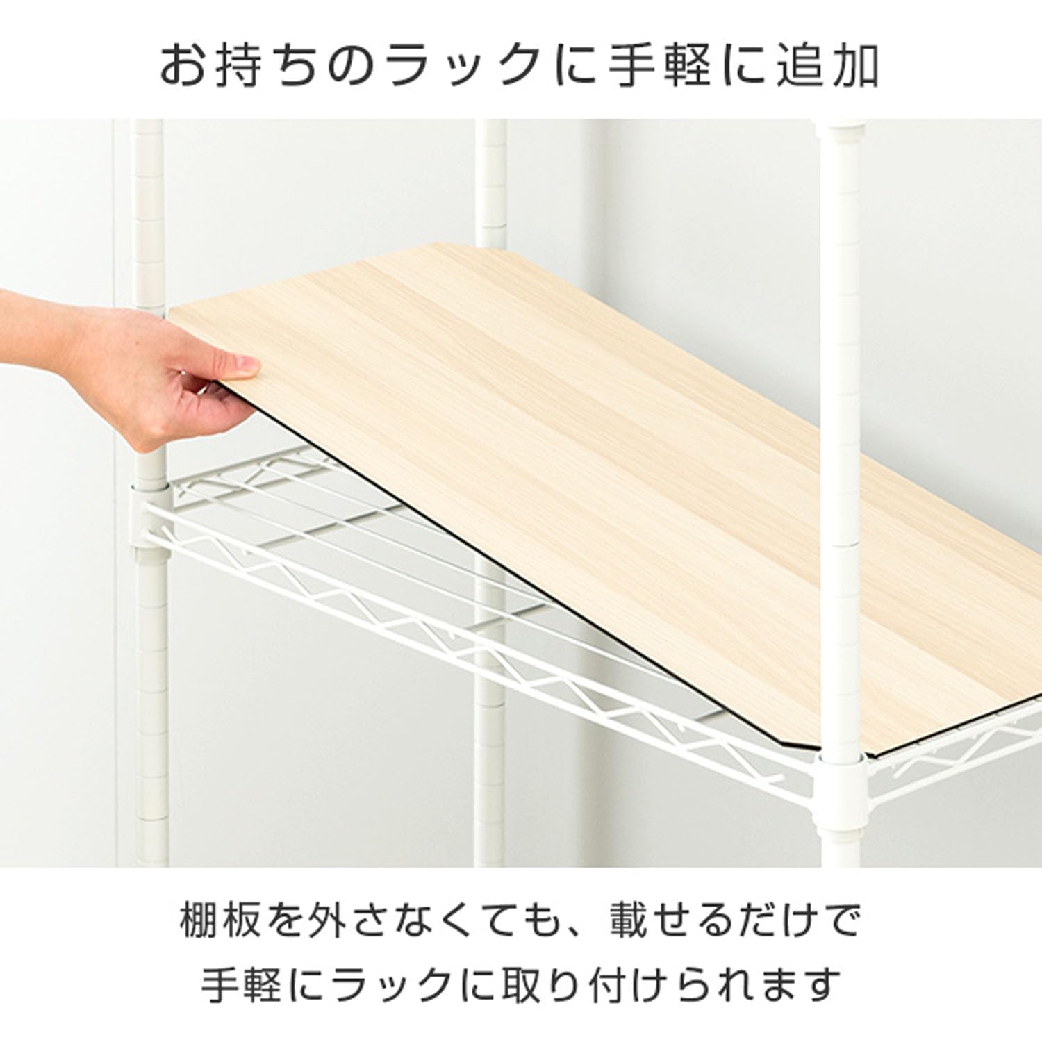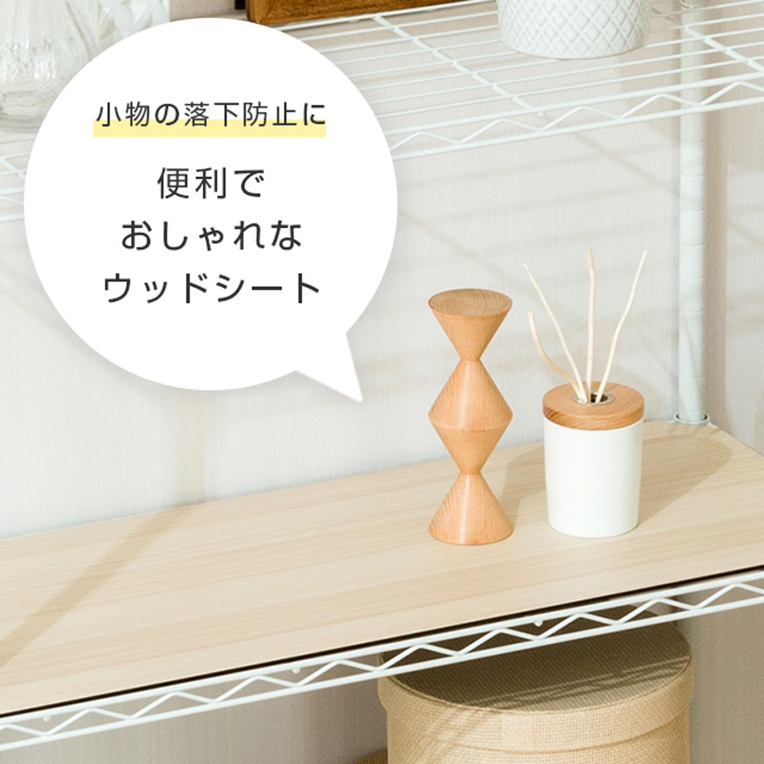 シェルフに乗せるだけで見た目のデザイン性と、ワイヤーの隙間からの落下防止の機能アップ 気分・インテリアによって選べるリバーシブルデザイン ※スライドシェルフには使用できません。
