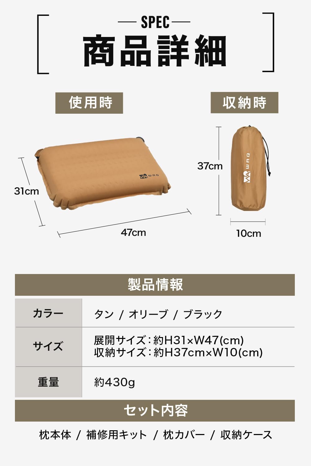 人気のアウトドアブランド【WAQ】から快適な睡眠をサポートする 車中泊・キャンプマットが登場!アウトドアに必需品のまくら です!【キャンプでも睡眠を妥協したくないあなたへ】クッション素材には弾力性に優れているウレタンを使用。エアーによるマットの張りを損なわずウレタンの気持ちいい弾力を実現!【丸洗い可能なシーツが付属】汗をかきやすい頭を支える枕には専用のシーツが標準装備!マット用シーツと同様に丸洗い可能なためいつでも清潔な状態でご使用いただけます。【厚みたっぷりのウレタン】最大7cmの極厚ウレタンがあなたの頭をしっかりサポート。弾力性のある生地と相まって寝心地が更に向上いたしました。【自動膨張】バルブを開くと自動で空気が入ります!さらに高機能バルブを搭載した事で空気の逆流を防ぎ、より効率よく空気を取り込むことが可能に。 ※初回空気入れ時は出荷状態のため空気の入りが遅くなります。