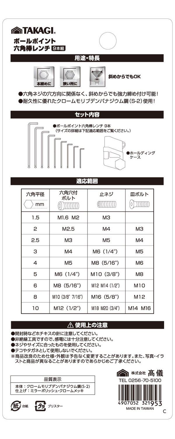 高儀 TAKAGI ボールポイント 六角棒レンチ 9本組