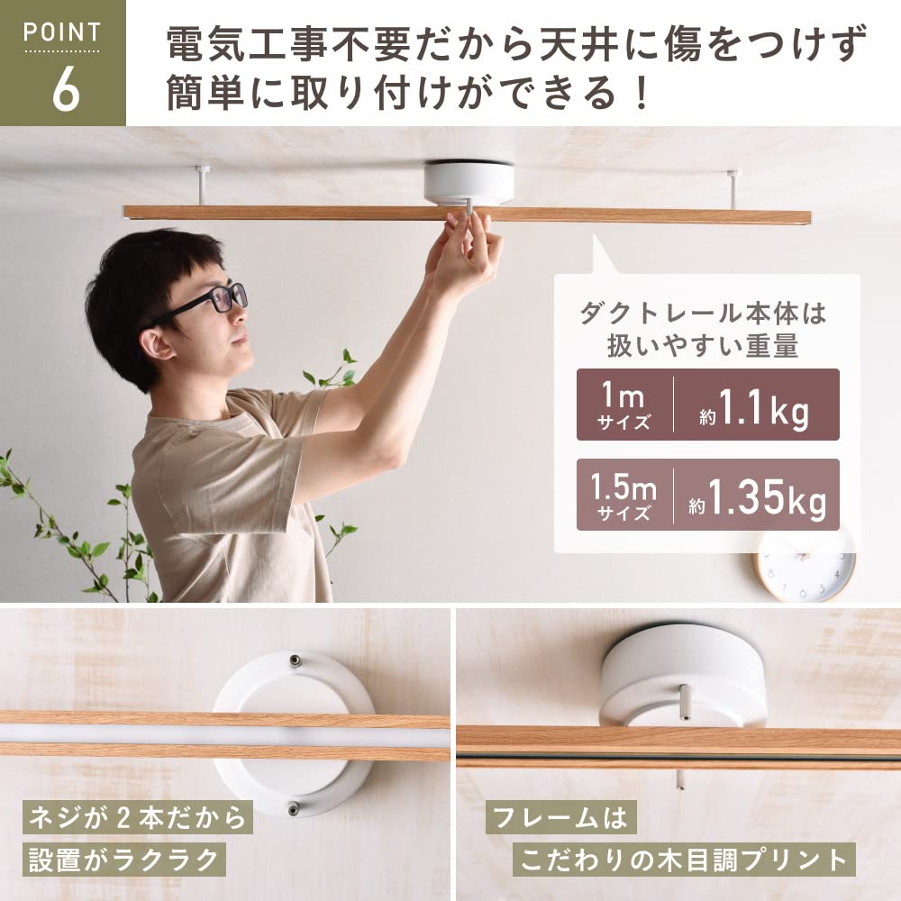 【ダクトレール全体が可動領域だから好きな位置にライトがつけられる!】レールほぼ全体が可動領域なので、通常のダクトレールのようなライトがつけられない端の部分や中間部分の位置にもライトの移動ができます。ダクトレールを使用すれば位置的にライトが届かない箇所もダイニングテーブルの真ん中に照明を設置することができます。また、1mと1.5mの2サイズだからお好みの長さをお選びいただきあらゆる場所でお使いいただけます。お気に入りの照明を選んで好みの位置に設置ができるので使い方次第でインテリアの幅がさらに広がります。※ペンダントライトを設置する際は、別売りの引掛けシーリングプラグをご使用ください。