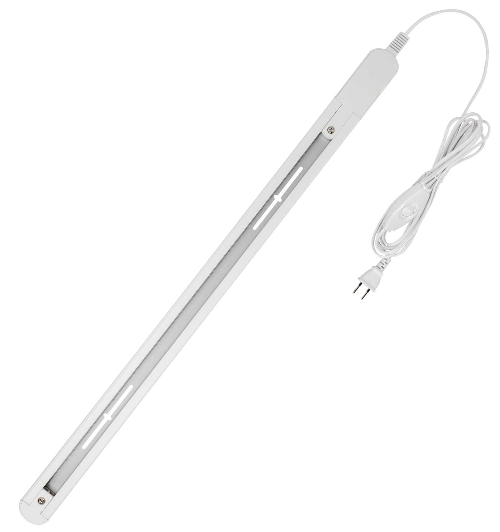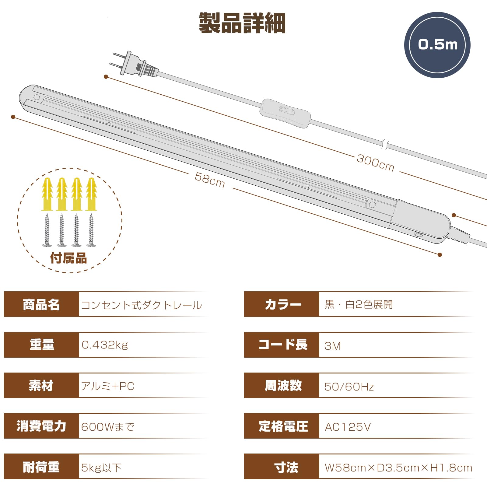 【製品仕様】商品名:コンセント式ダクトレール 寸法:全長約W58.3cm×D3.5cm×H1.8cm コード長:3M 重量:0.432kg 材質:アルミ+PC カラー:白(ホワイト) 定格電圧/電流:AC125V 7A 600Wまで 取付け可能器具の総重量:5kg以下。ご注意:スポット器具・電球別売り