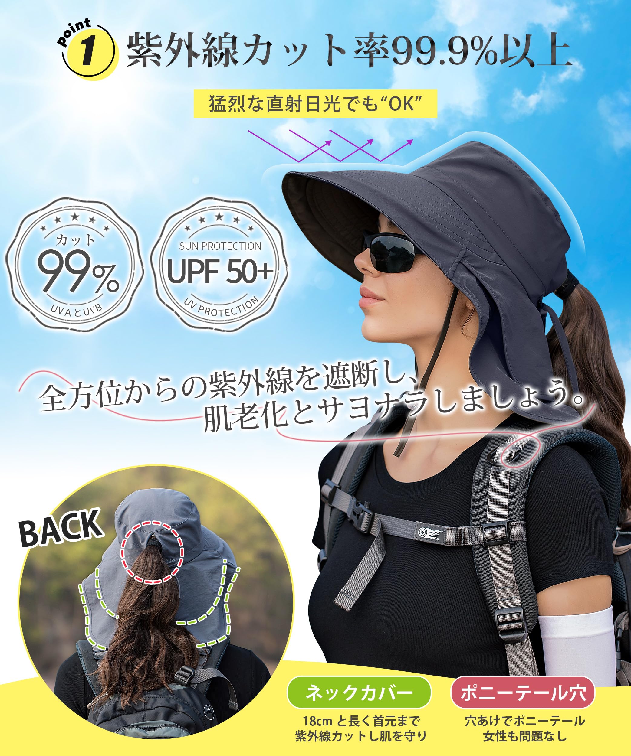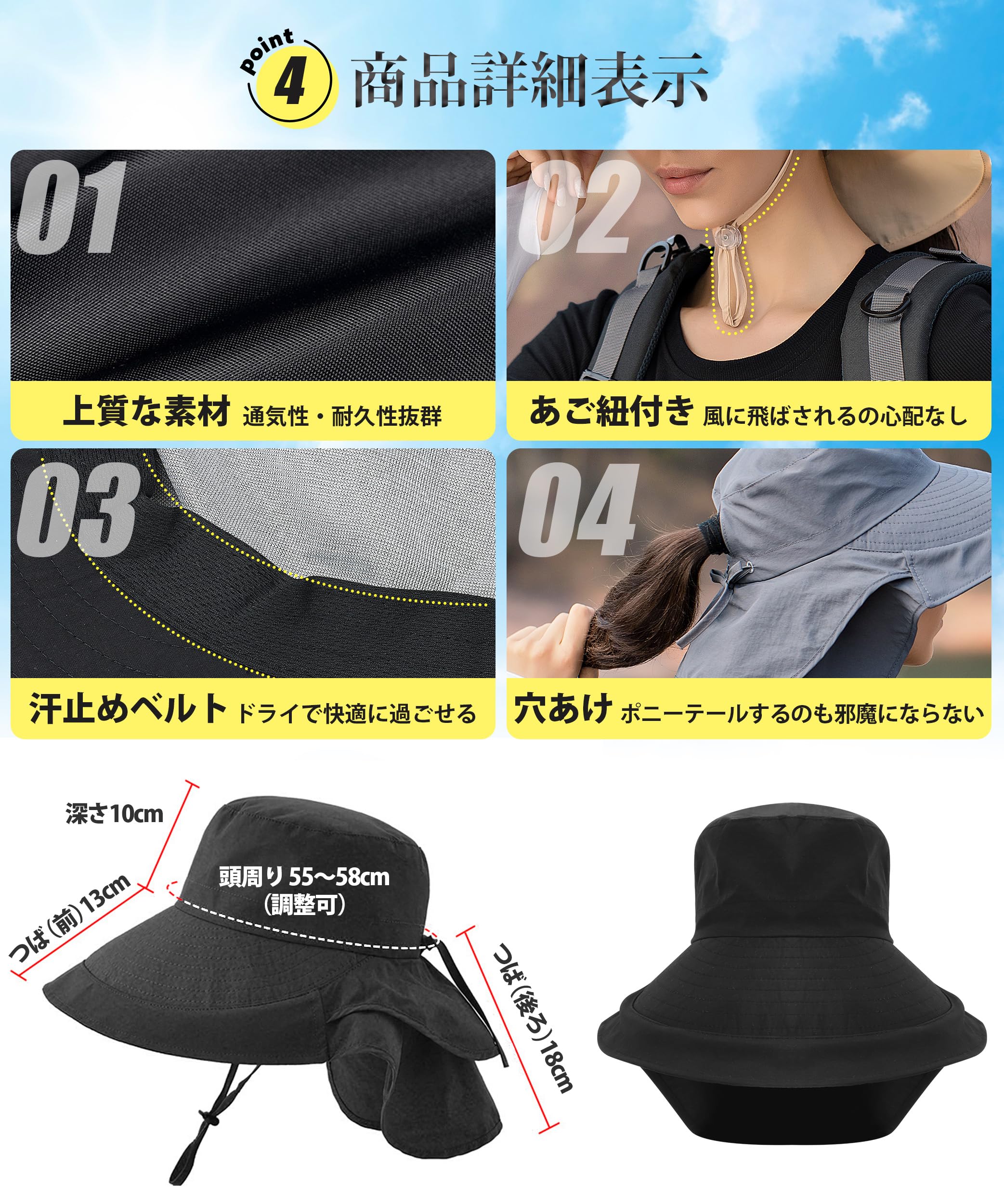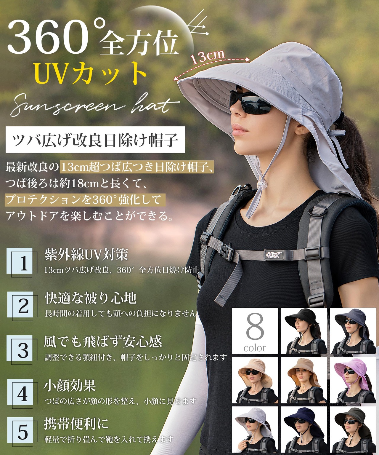 【ツバ広げ改良・全方位UVカット】最新改良の13cm超つば広つきレディース日除け帽子。帽子の頭周り約55〜58cm、深さ約10cm、つば後ろは約18 cmと長くて。360度全方位保護のため、顔から首元まで紫外線から守ってくれます。効果的紫外線を遮蔽率99.9%以上でき、保護指数UPF50+こともあり、猛烈な直射日光から頭とお肌を守ります。日差しが強い日は、熱中症予防にも役立ちます。