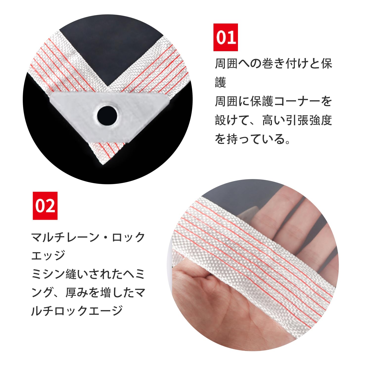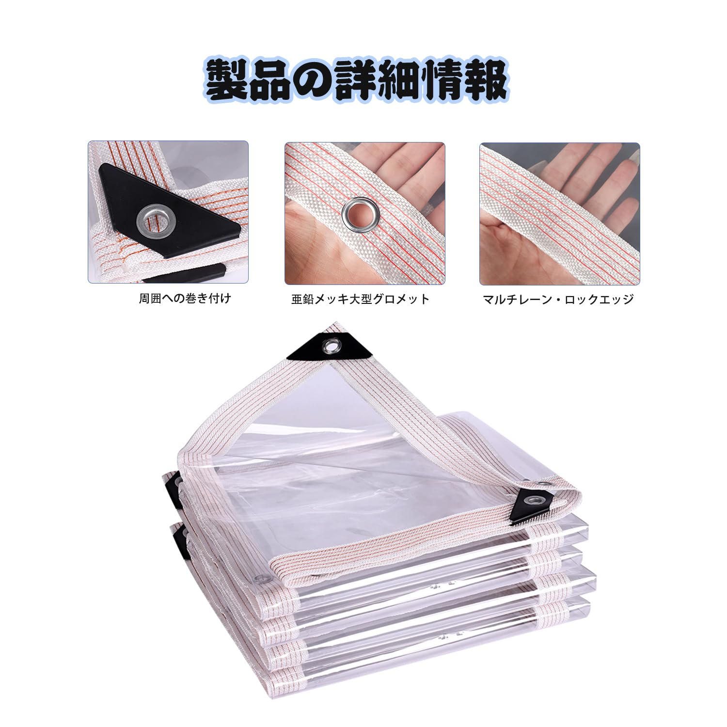 【特製の5cmエッジ】特製の5cmエッジは、より強く、より耐久性があります。5cmの補強されたエッジを備えた透明なブルーシートは製品を風害などの災害から保護し、耐久性と安全性に優れています。また、ターポリンを簡単で素早く固定できるよう、6本の弾性縄を用意しています。