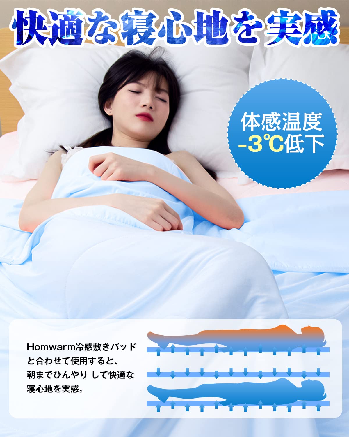 【冷房費節約】布団の中わたに取り入れた特殊ポリエステル繊維は吸湿性・ 放湿性に優れているため、寝ている間に体内にこもった熱を放出して体温を下げ、まるで空調をつけているような冷たさを感じることができます。Homwarm冷感敷きパッドと合わせて使用すると、感触がよりソフトなうえ、上質な寝心地を実現します。