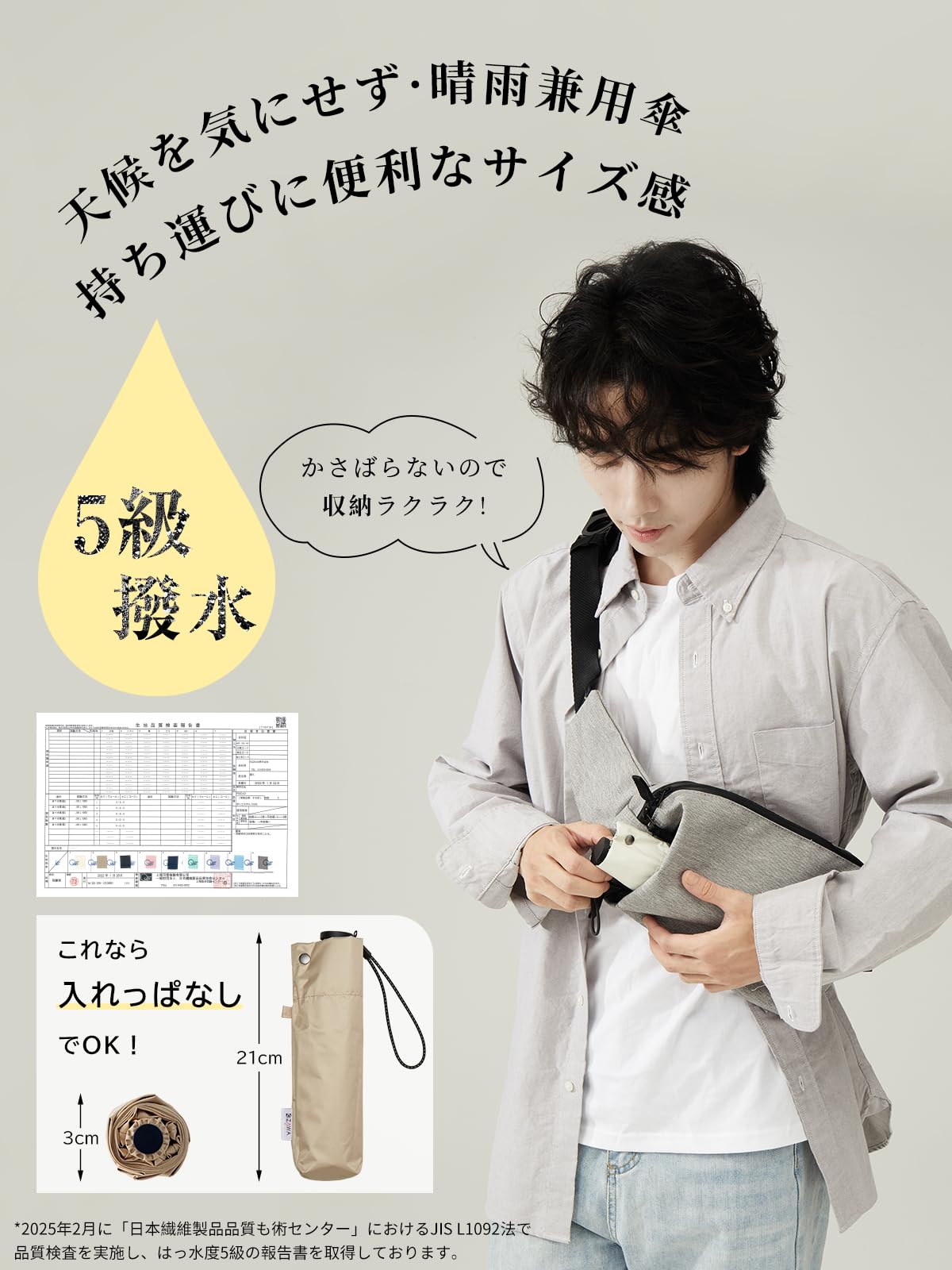 【超軽量123gから・携帯便利】高級傘に使用されるカーボンファイバーを採用し、直径88cmの大きさでありながら、重さはわずか123g-156g。5本骨バージョンと比べてカバー面積は約9%増加し、重さは約15g増加したにすぎません。スマホより軽く、持っていることを忘れるほど軽快で、通学や通勤にもストレスなく持ち運べます。突然の雨や思わぬ日差しに大活躍してくれます。全長約50cm、親骨50cm、直径約88cm、収納時は約21cmとコンパクトで、カバンにもすっきり収納できます。日常に溶け込み、いつでも持ち歩きたくなるデザインと使いやすさを追求しました。