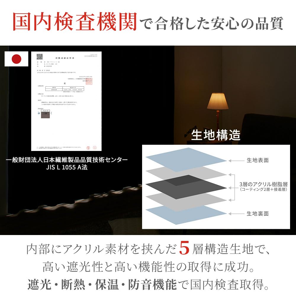 【一級遮光】このカーテンは遮光度が99.99%以上,外からの光をほとんど通さないため、昼間でもカーテンを閉めるとお部屋を暗くできます。同じ等級であっても、カーテンの明度や色彩によって遮光の度合いが変わります。薄い淡い色は光を通しやすく、濃い暗い色は光を通しにくいです。遮光性を重視される方は濃色をおすすめします。