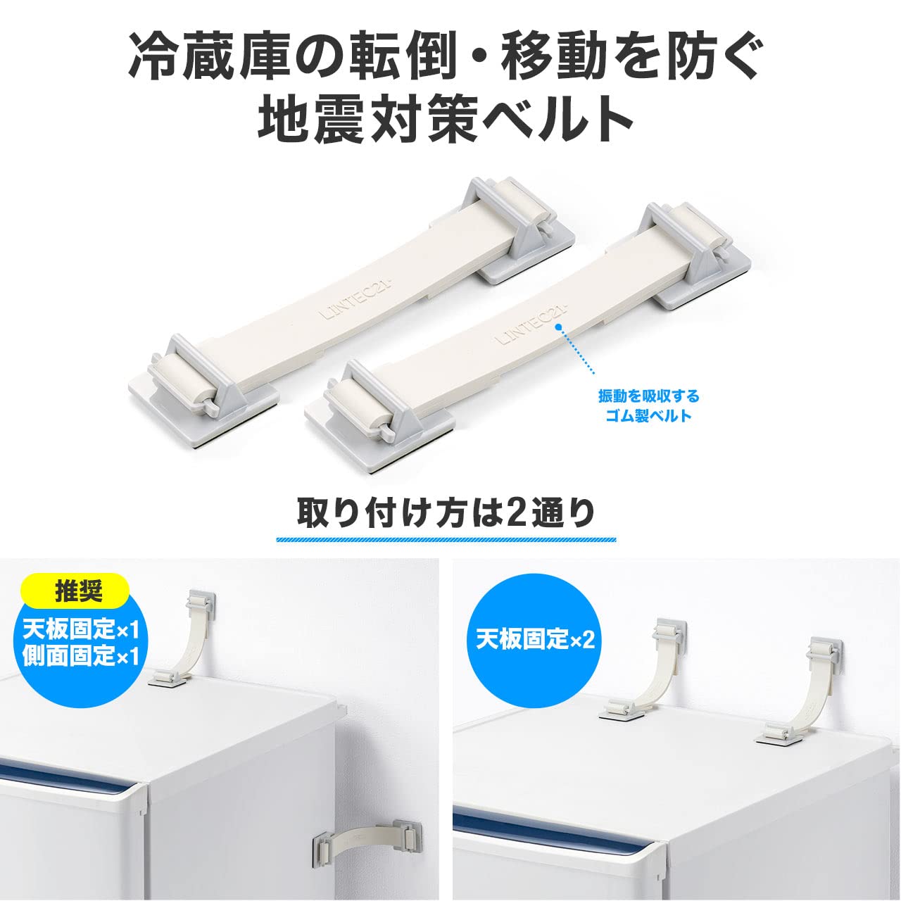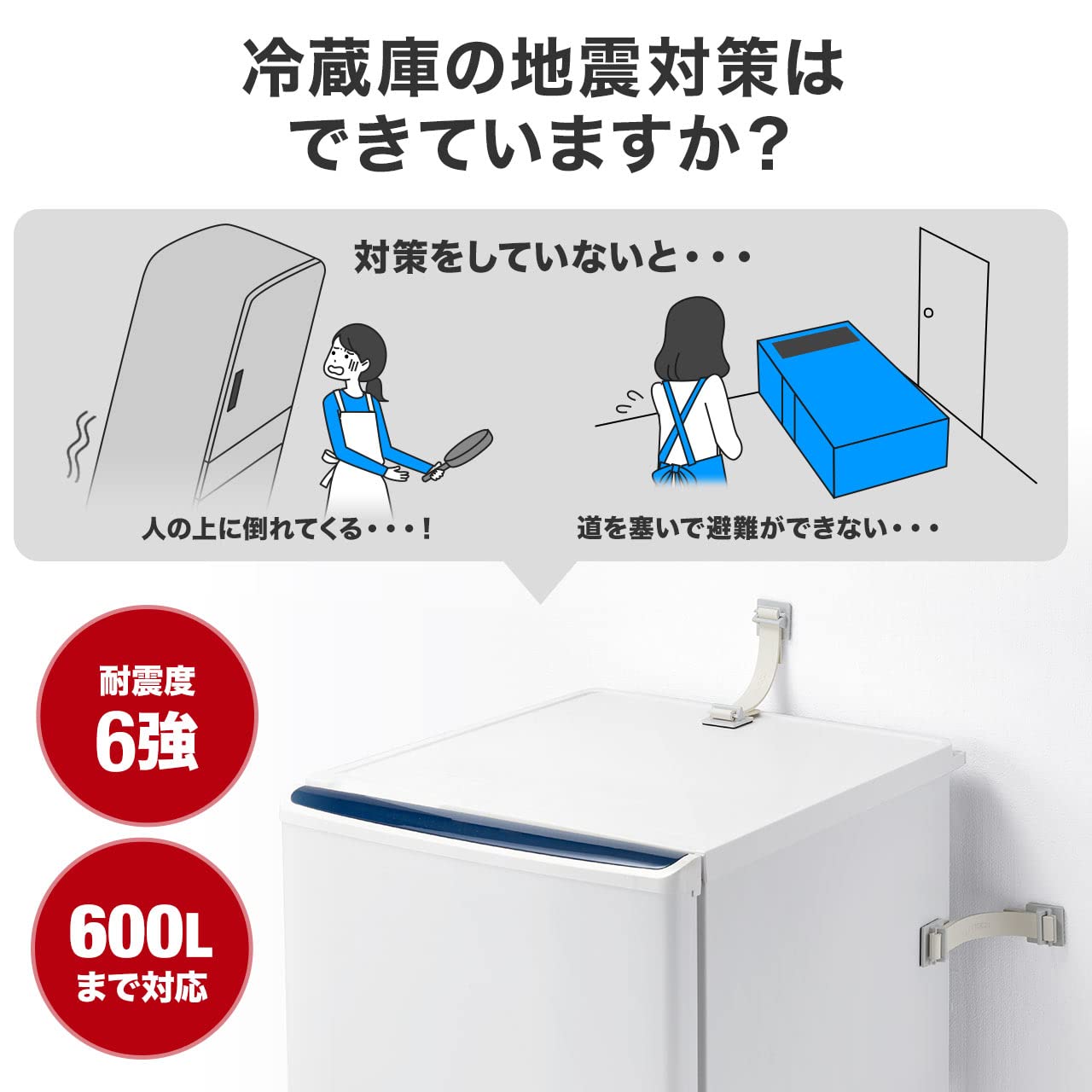 2本のベルトで、600Lまでの冷蔵庫を固定する事ができます。
