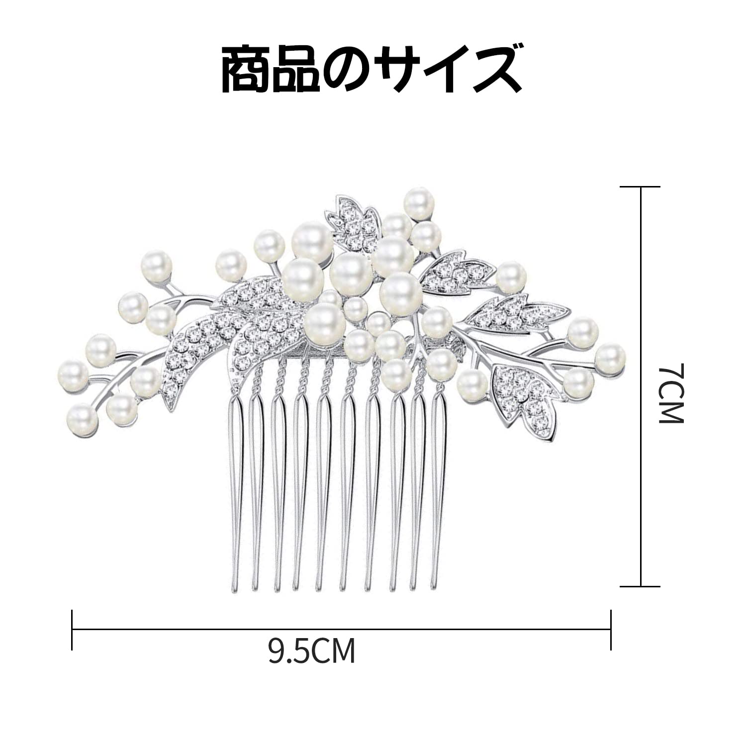 【サイズ、素材】(横幅)約9cm (縦幅)約7cm(厚さ)約15mm コーム部:約30mm。重量:約25g。コームカラー:シルバー。素材:亜鉛合金、アクリル樹脂、パール。