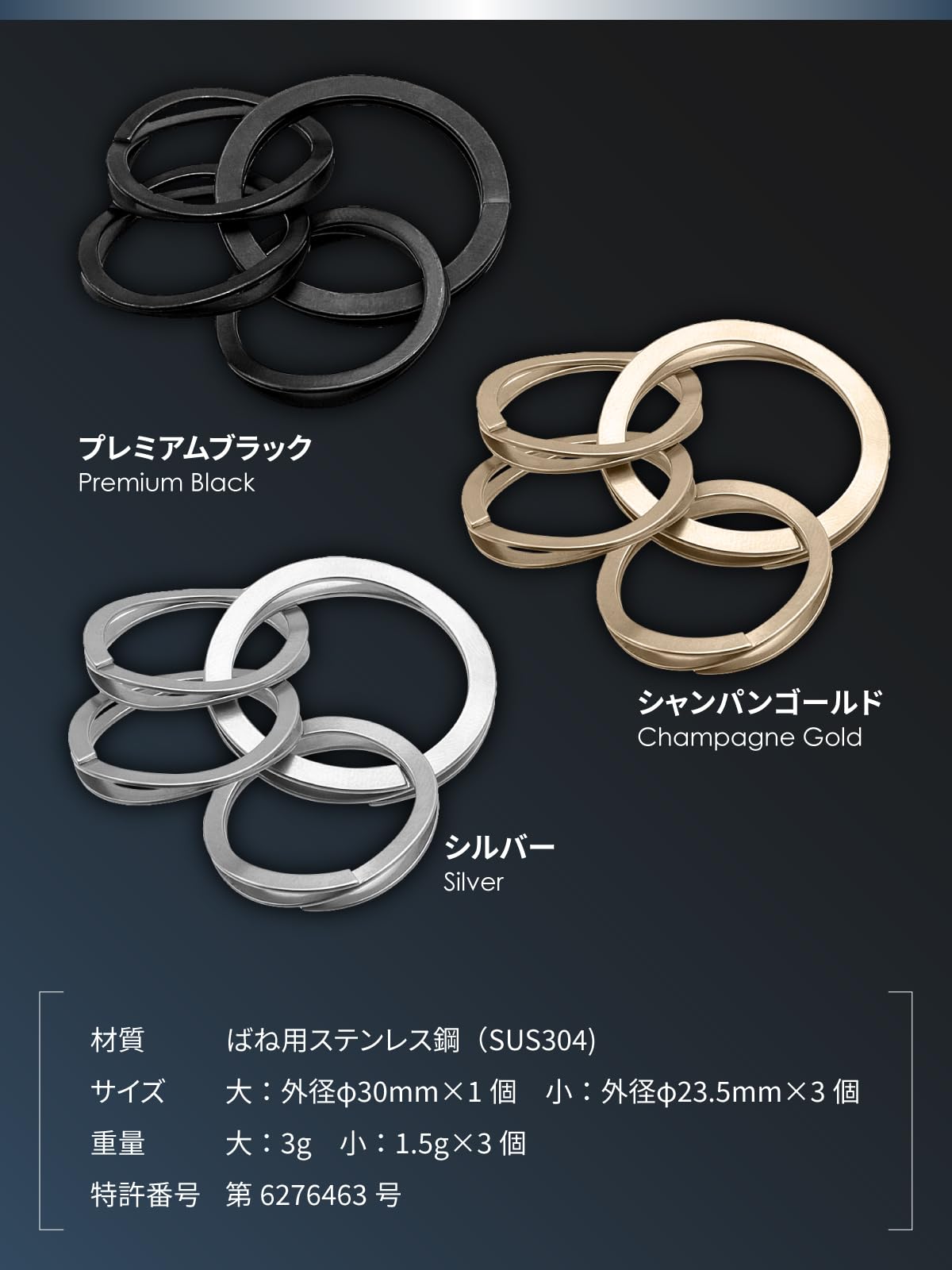 【カラー】プレミアムブラック【材質】ばね用ステンレス鋼(SUS304)【サイズ】大:外径φ30mm×1個 小:外径φ23.5mm×3個【重量】大:3g 小:1.5g×3個【特許番号】第6276463号【ステンレスを塗装することは技術的に難しいですが、特殊な処理により黒く染めています。】