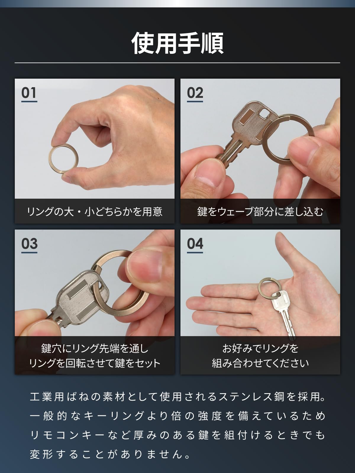 [Waveclips] キーリング 日本製 特許取得 工業用ばね 落ちない 軽量 高強度 ステンレス 外れない 取付け簡単 爪を傷めない ギフト リング 鍵 スマートキーリング キーホルダー 4個セット