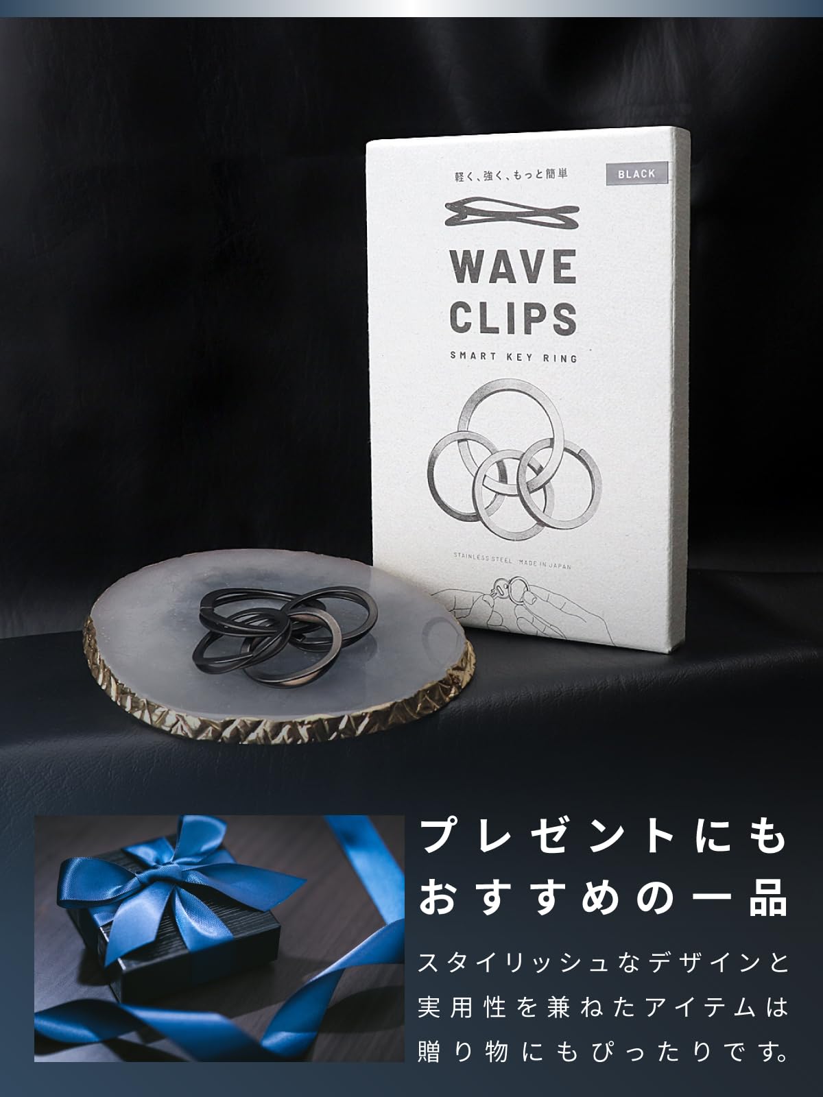 【本当に使いやすいキーリングとは?】SMART KEY RING 「軽く、強く、もっと簡単」辿り着いたのは、 円弧が連なったウェーブ形状。軽く、強く、使いやすい。 そのすべてを兼ね備えた機能美は、最先端技術を支える 特殊なばねのメカニズムによって実現しました。 無骨なまでにシンプル。だからこそ、細部まで追求する。こだわる人のためのWAVECLIPSです。