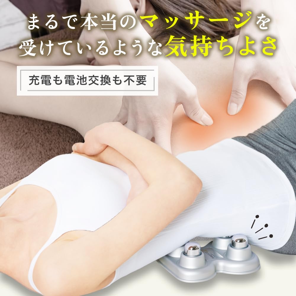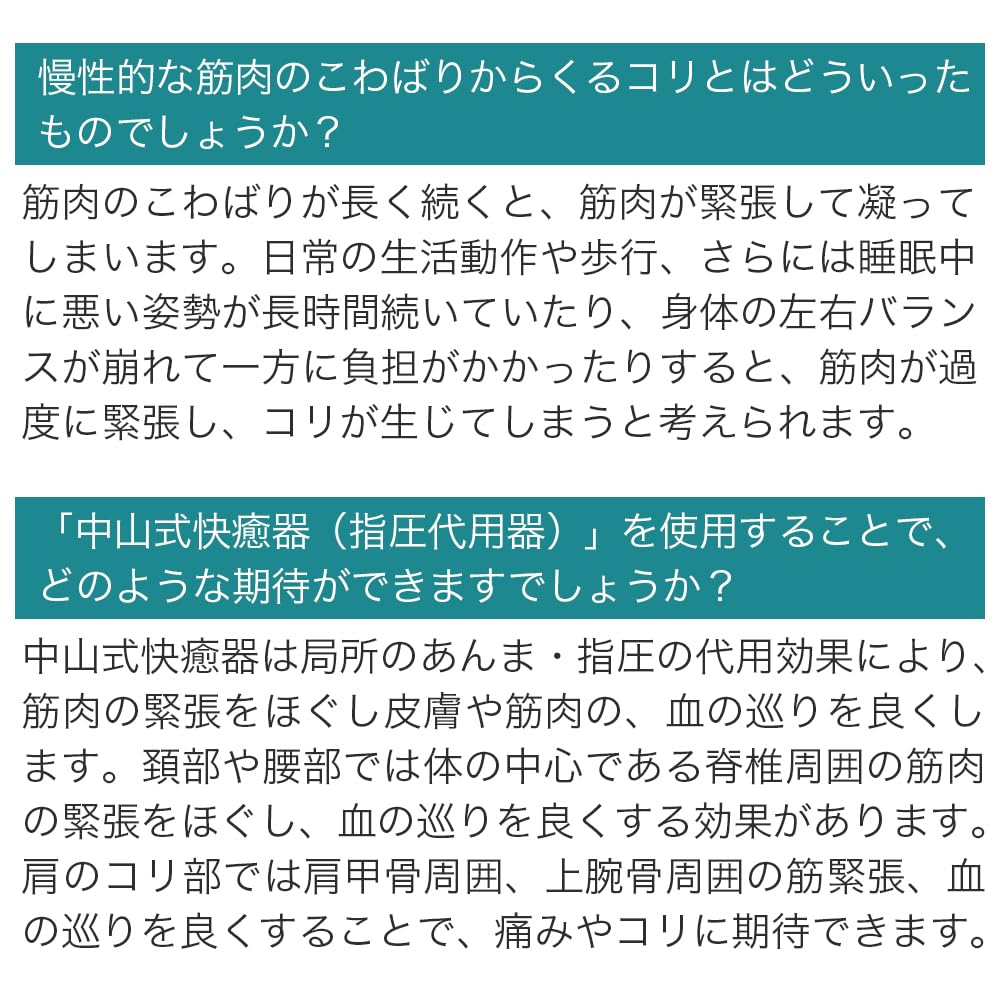 中山式快癒器は昭和22年に発売以来、半世紀以上に渡り愛され続けている当社のロングセラー商品です。快癒器の上に仰向けに寝て体重をかけるだけで、球頭が「あんま」「指圧」の働きを代用しコリをほぐします。