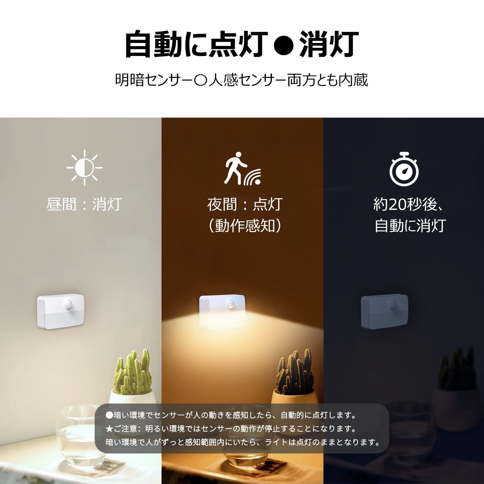 【人感センサーライト】Ledセンサーライト カバーあり●暗い環境でモーションセンサーが人の動きを感知したら、自動的に点灯します。暗闇に電灯のスイッチを探す手間もなくなり便利です。★ご注意:明るい環境ではセンサーの動作を停止することになります。人がずっとその場所にいたらライトは点灯のままとなります。
