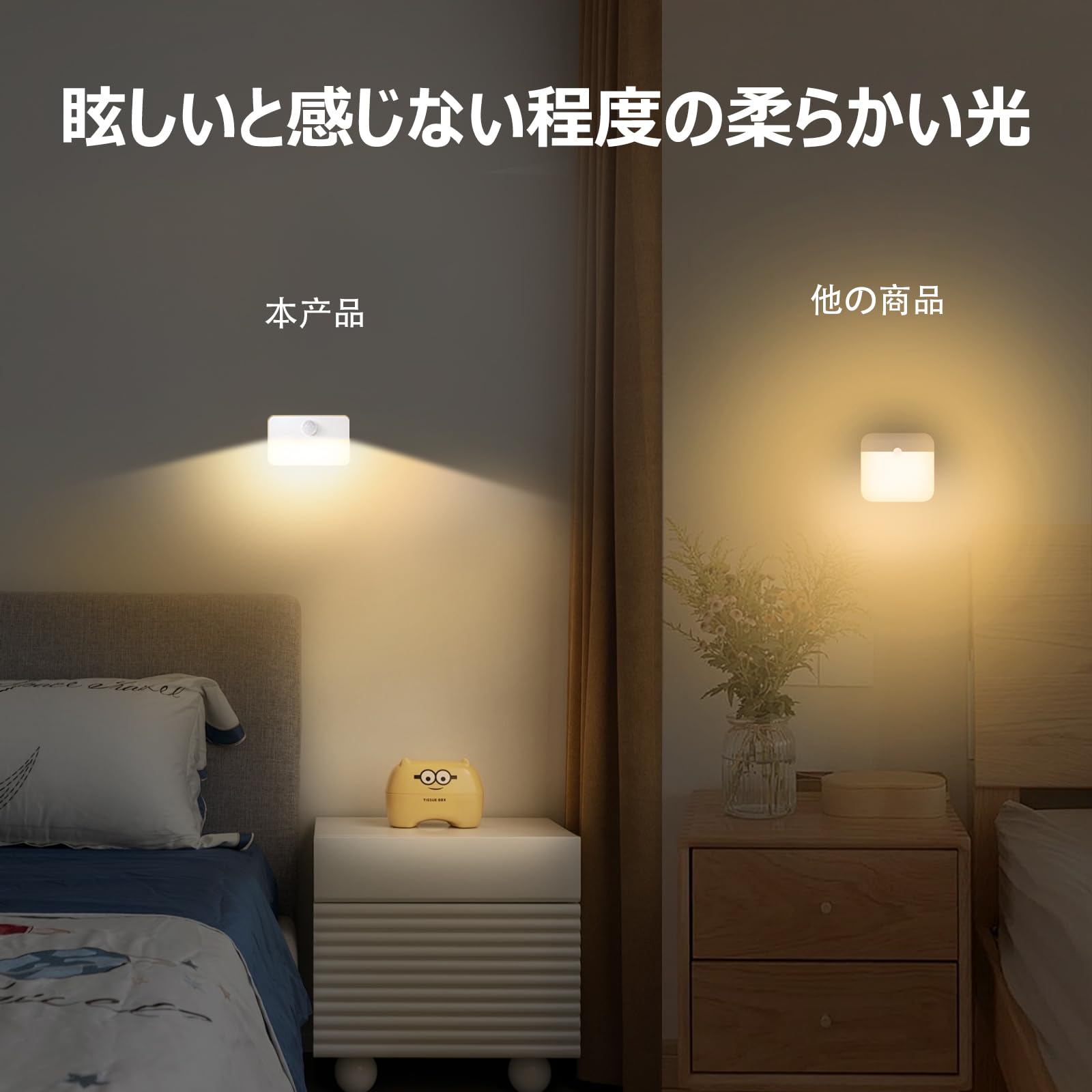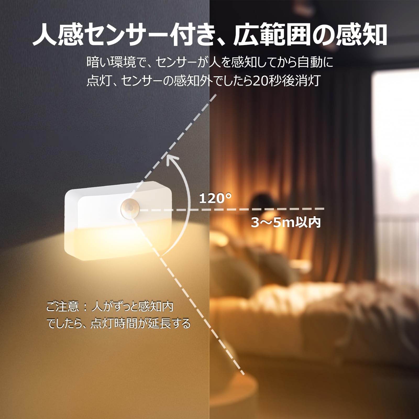 【感知範囲】暗くなると120°の広角範囲とおよそ3メートルの距離内の動きを検知したら点灯します。暗い室内や廊下、階段も、安心で危なげなく移動することができます。 ナイトライトとしても使います。