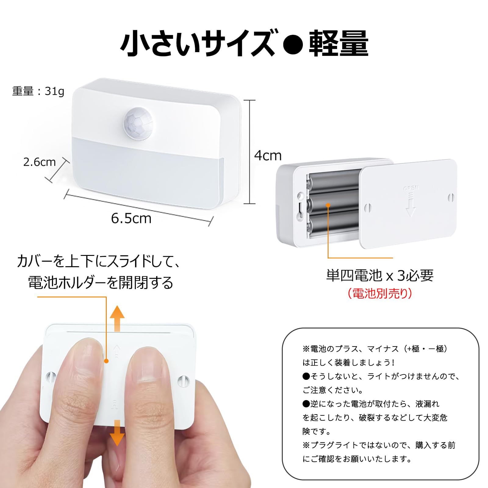 【省エネ*小型】Ledセンサーライトは動きが検出されないと、20秒後に自動的に消灯し、エネルギーを節約し、バッテリ寿命をより長くすることができます。 。小型のライト本体はとても軽量で、狭い隙間にも使える省スペース設計です。思ったより小さい声もありますので、注文する前にサイズをご確認ください。